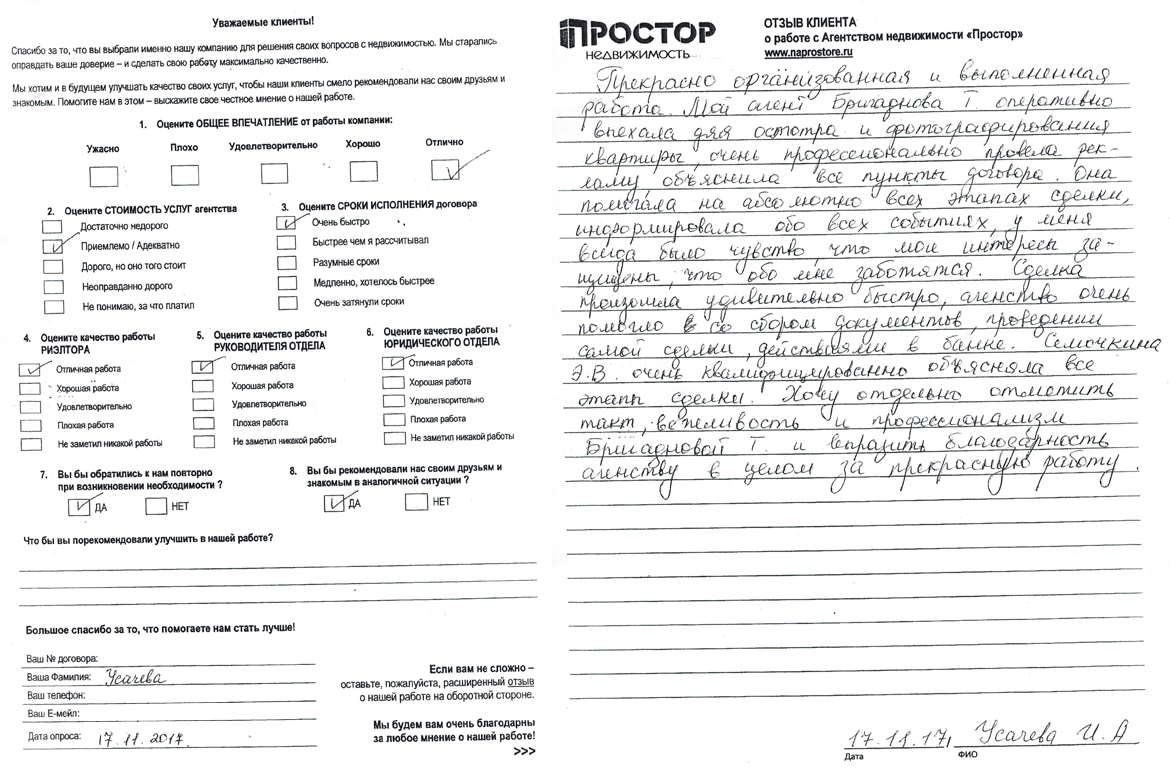 Прекрасно организованная и выполненная работа. Мой агент Бригаднова (Склярова) Т. оперативно выехала для осмотра и фотографирования квартиры очень профессионально провела рекламу объяснила все пункты договора. Она помогала на абсолютно всех этапах сделки, информировала обо всех событиях, у меня всегда было чувство, что мои интересы защищены, что обо мне заботятся. Сделка произошла удивительно быстро, агенство очень помогло со сбором документов, проведении самой сделки, действиями в банке. Семочкина Э.В. очень квалифицированно объяснила все этапы сделки. Хочу отдельно отметить такт, вежливость и профессионализм Бригадновой Т. и выразить благодарность агентству в целом за прекрасную работу.