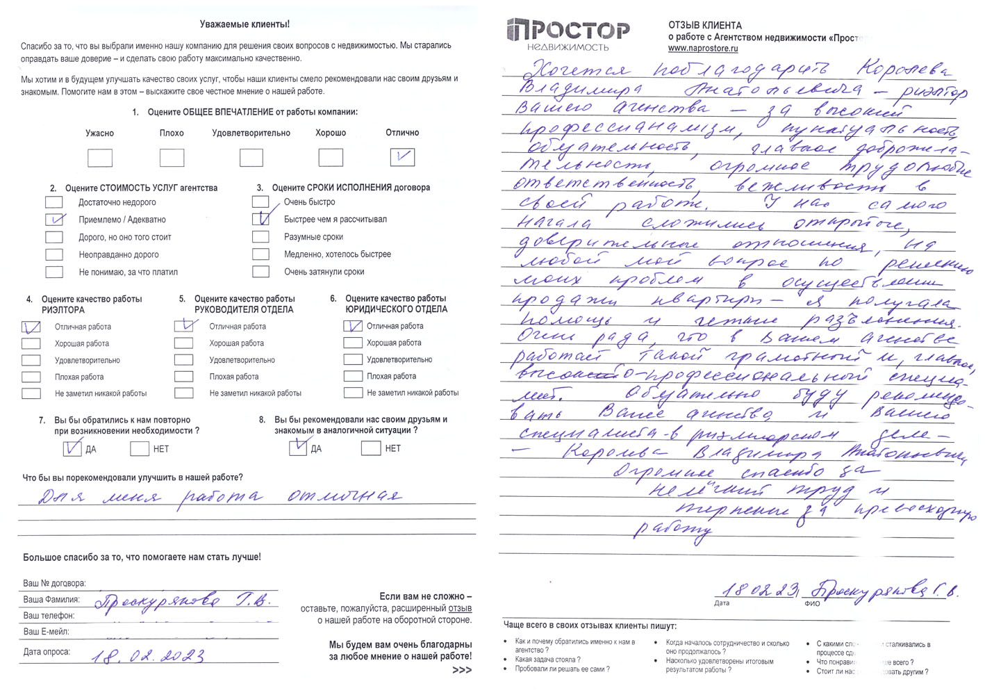 Повторно обратился к АН «Простор», снова все прошло хорошо и я доволен тем, как проходил весь процесс по продаже квартиры. Спасибо Ольге Меньшиковой и Юлии Рощикулиной за проведенную работу! Все прошло быстро, динамично и всегда в контакте по всем вопросам, отдельный большой плюс, что окончательная стоимость продажи получилась даже чуть больше предполагаемой сначала!
