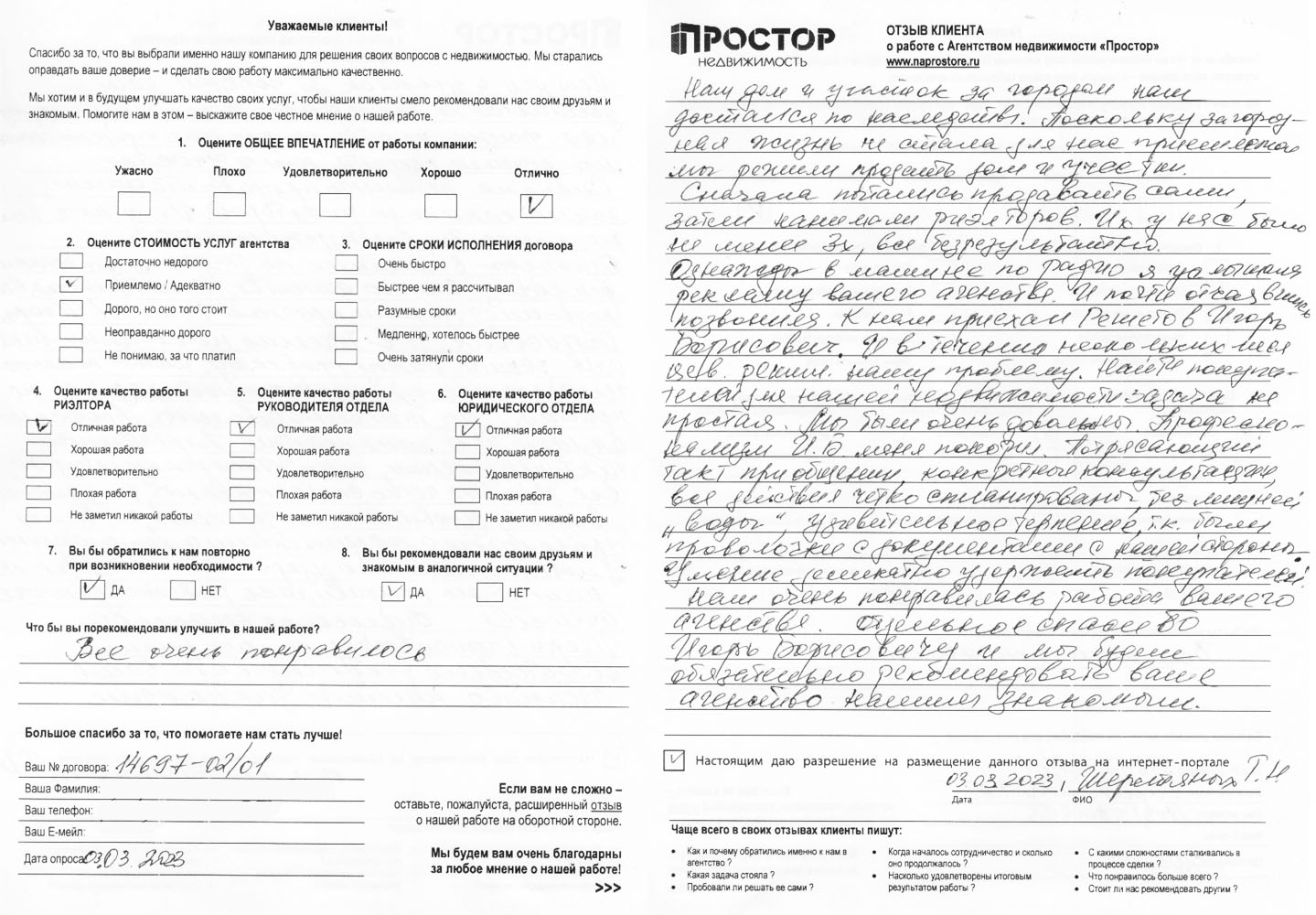 По рекомендации обратился в агентство недвижимости "Простор" с целью продажи квартиры в МО. Хочу поблагодарить сотрудников агентства Маркопольскую Евгению и Рыскину Надежду за отличную организацию процесса.