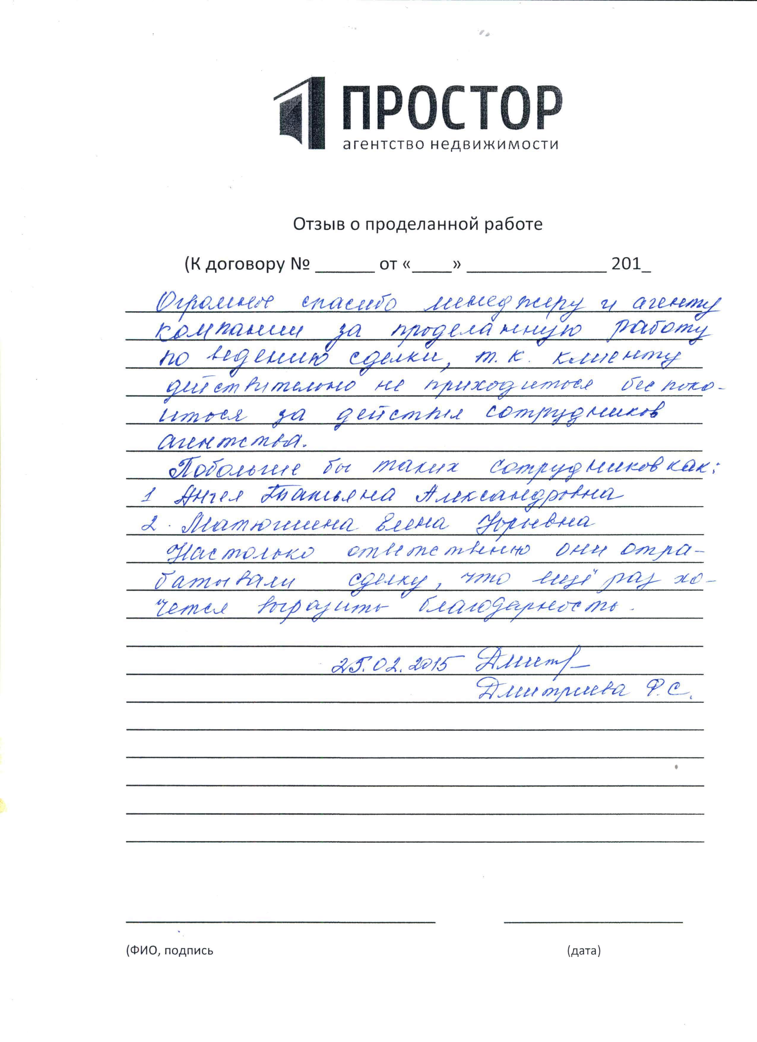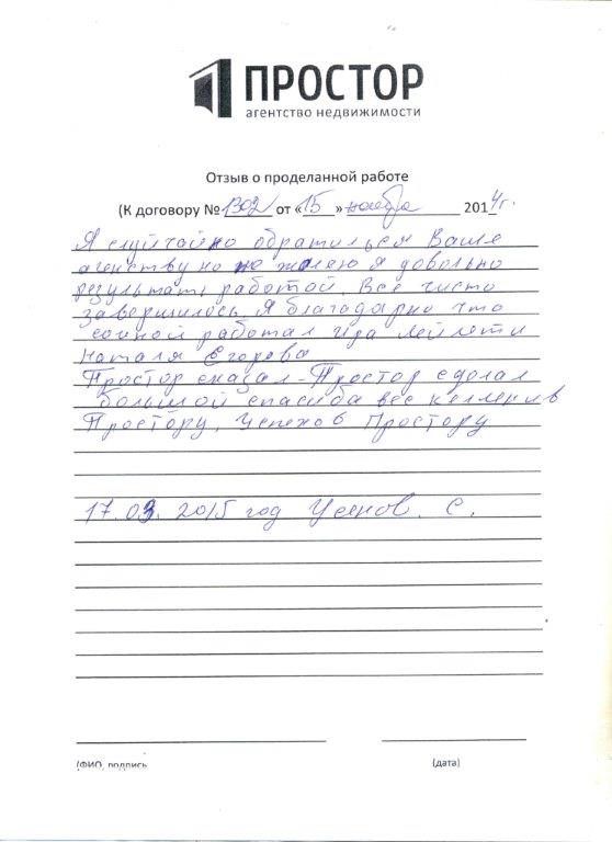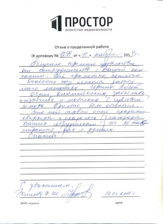 Я случайно обратился в Ваше агентство, но не жалею. Я доволен результатом работы. Все чисто завершилось! Я благодарен, что со мной работала Ира Лелет и Наталья Егорова. Простор сказал - Простор сделал. Большое спасибо всему коллективу Простора, успехов Простору!