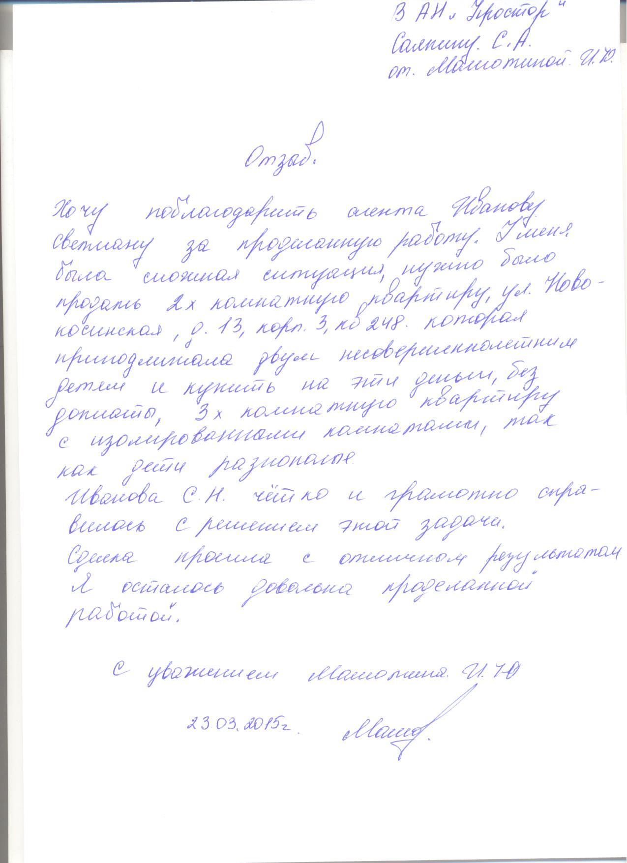 Хочу поблагодарить агента Иванову Светлану за проделанную работу. У меня была сложная ситуация, нужно было продать 2-х комнатную квартиру, ул. Новокосинская, д. 13, корп. 3, кв. 248, которая принадлежала двум несовершеннолетним детям и купить на эти деньги, без доплат, 3-комнатную квартиру с изолированными комнатами, так как дети разнополые. Иванова С. Н. четко и грамотно справилась с решением этой задачи. Сделка прошла с отличным результатом. Я осталась довольна проделанной работой.