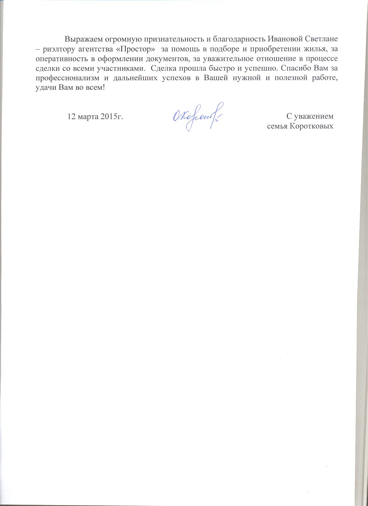 Выражаем огромную признательность и благодарность Ивановой Светлане за помощь в подборе и приобретении жилья, за оперативность в оформлении документов, за уважительное отношение в процессе сделки со всеми участниками. Сделка прошла быстро и успешно. Спасибо Вам за профессионализм и дальнейших успехов в Вашей нужной и полезной работе, удачи Вам во всем!