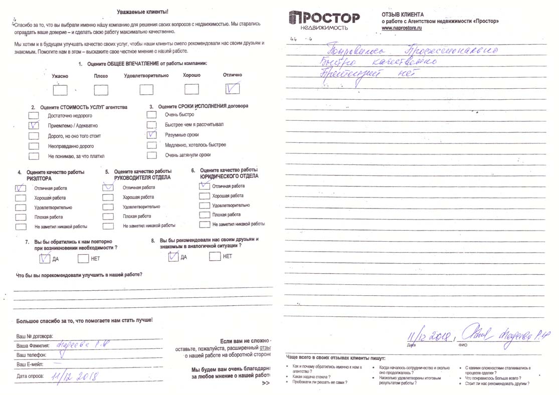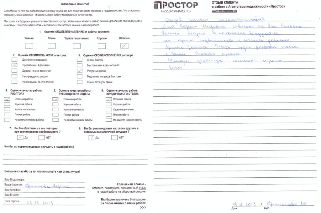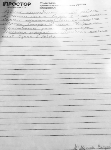 Почти у каждого человека хоть раз в жизни возникает вопрос купли-продажи недвижимости, но далеко не каждый готов к этому событию и морально, и информационно. В числе таких неподготовленных граждан однажды оказалась и я. Варианты «была, ни была» и «авось» меня никак не устраивали. Гигабайты информации в интернете были проштудированы, миллионы постов на форумах прочитаны, оставался самый важный момент этого предприятия – поиск подходящего агентства недвижимости. Был составлен немаленький список обзвона, и процесс пошел. В каждом агентстве мне сулили золотые горы и коньки в придачу, но как-то все не верилось. В агентстве недвижимости «ПРОСТОР» никаких «гор» мне обещать не стали, оперативно и объективно оценили мою квартиру. Агент Аркадий Каргинов четко и по пунктам объяснил мне процесс сделки... и не один раз... так как с первого раза, и даже со второго я мало что поняла и запомнила. Было еще много вопросов, и все они не оставались без внимания и понятных для меня ответов. Аркадий был всегда на связи и готов помочь, каждую неделю я получала краткое резюме наших с ним переговоров и подробное описание процесса поиска покупателя. Грамотный, компетентный, всегда вежливый и приятный в общении – агентство «ПРОСТОР» может по праву гордиться таким сотрудником. Особенно порадовало тот факт, что обещанное перед подписанием договора с агентством, и итог при завершении сделки совпали в самых мелких подробностях, никаких доплат, раннее не оговоренных не случилось, и на протяжении всего процесса ни в коей мере не навязывалось. В результате, предприятие, сулившее до обращения в это агентство бессонные ночи, расшатанные нервы и потерю кучи времени обернулось приятным познавательным процессом. Без сомнения, Аркадия Каргинова ждет большое будущее в мире недвижимости, чего я и моя семья от всей души ему желаем. Подписываясь под каждым словом, Анастасия Хенох.