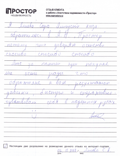 Я, Алиева Сара Алигусейн Кызы, обратилась в АН "Простор", потому что доверяю агентству. Спасибо, спасибо, спасибо Анне за помощь при покупке, мы очень рады, что обратились к вам. Результатом довольны, быстро и оперативно, чувствовали себя в надежных руках.