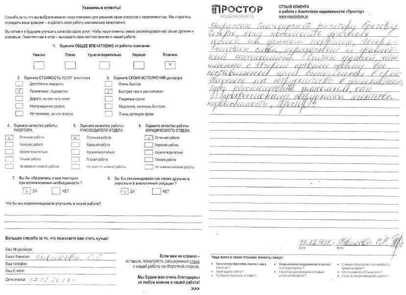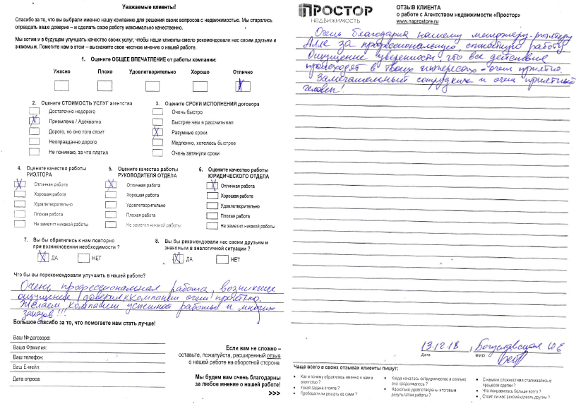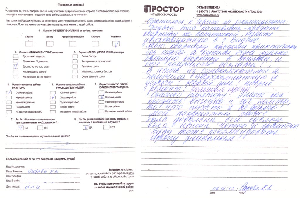 Хочу публично выразить благодарность агентству "Простор" отд. Цветной бульвар в целом, Лоле Эмильевне Эйтвин и Юлии Владимировне Лурье отдельно за удачно завершенную сделку по продаже нашей квартиры. Начальные данные: Был 2к квартира (на самом деле полуторка 41 квм с маленькой "маленькой" комнатой, небольшой кухней и совмещенным СУ) в панельной 9ти этажке в Подольске. Задача стояла как чистая продажа, т.к. квартирой не пользовалась и прописанных не было. Цель: Получить деньги и с доплатой купить другую квартиру в Подольске с улучшенными характеристиками. По процессу продажи и реализации сделки: С самого начала обсудили и согласовали план реализации задуманного. Лола и Юлия порекомендовали оптимальную стратегию и последовательность. Далее рутина - звонки, показы. Правда эта рутина немного затянулась (продавали больше полугода), но связываю это с характеристиками самого объекта. Как уже писала выше квартира с нестандартными параметрами и к тому же недавнем наследством. А в Подольске сейчас построен новый район, Кузнечики, в котором новострой большей площади отдают недорого относительно старых обжитых районов. Лола всегда была на связи, сообщала о колебаниях в интересе к квартире, исходя из чего мы корректировали ценник. Сама же сделка прошла для нас более чем комфортно, приехали в банк (у покупателя была ипотека) подписали документы, разъехались. Предварительной подготовкой занималось агентство, нас не беспокоя, согласовывая только ключевые моменты. Деньги на счет в банке после регистрации собственности. Сейчас той же командой работаем над второй частью - покупка другой квартиры. Лола, Юлия еще раз СПАСИБО. http://forum.ners.ru/viewtopic.php?f=91&t=40323