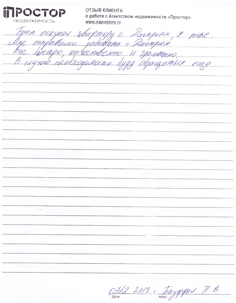 Брат покупал квартиру с Дмитрием, я тоже. Мне понравилось работать с Дмитрием. Все быстро, качественно и грамотно. В случае необходимости, буду обращаться еще.