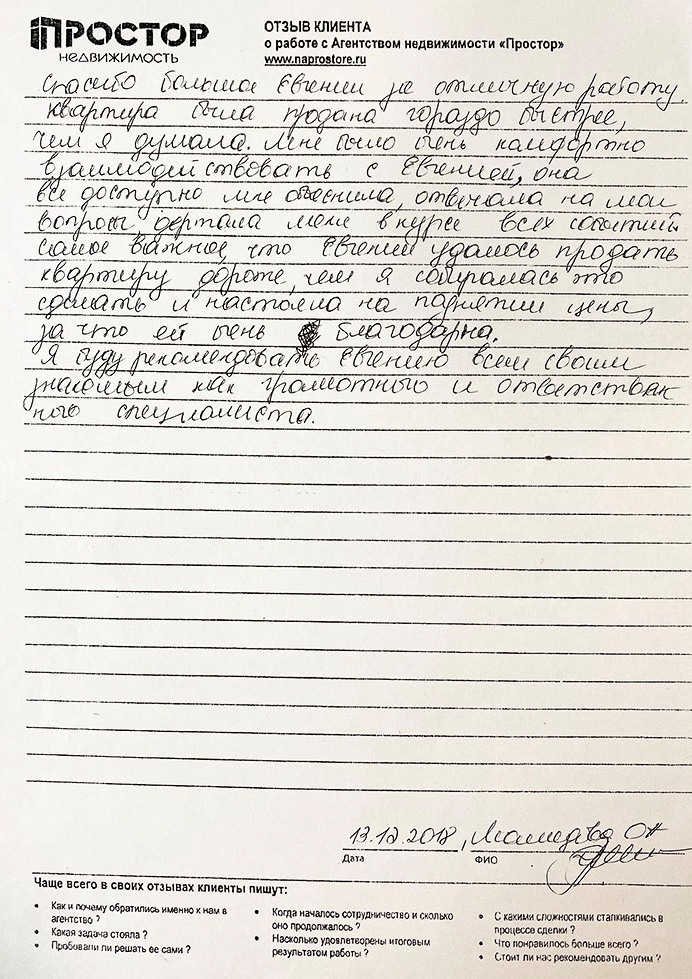 Спасибо большое Евгении за отличную работу. Квартира была продана гораздо быстрее, чем я думала. Мне было очень комфортно взаимодействовать с Евгенией, она все доступно мне объяснила, отвечала на мои вопросы, держала меня в курсе всех событий. Самое важное, что Евгении удалось продать квартиру дороже, чем я собиралась это сделать и настояла на поднятии цены, за что ей очень благодарна. Я буду рекомендовать Евгению всем своим знакомым как грамотного и ответственного специалиста.