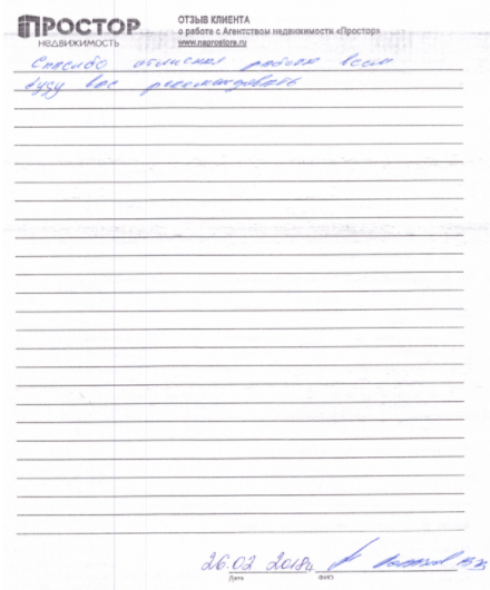 Повторно обратился к АН «Простор», снова все прошло хорошо и я доволен тем, как проходил весь процесс по продаже квартиры. Спасибо Ольге Меньшиковой и Юлии Рощикулиной за проведенную работу! Все прошло быстро, динамично и всегда в контакте по всем вопросам, отдельный большой плюс, что окончательная стоимость продажи получилась даже чуть больше предполагаемой сначала!