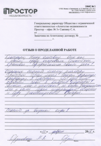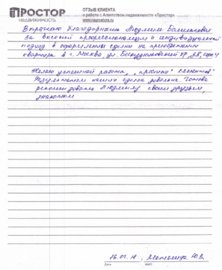 Выражаю благодарность Людмиле Башлыковой за высокий профессионализм и индивидуальный подход в оформлении сделки на приобретение квартиры в г. Москва, ул. Бескудниковский б-р, д.8, корп.4. Желаю успешной работы, "простых" клиентов. Результатом наших сделок довольна. Готова рекомендовать Людмилу своим друзьям, знакомым.