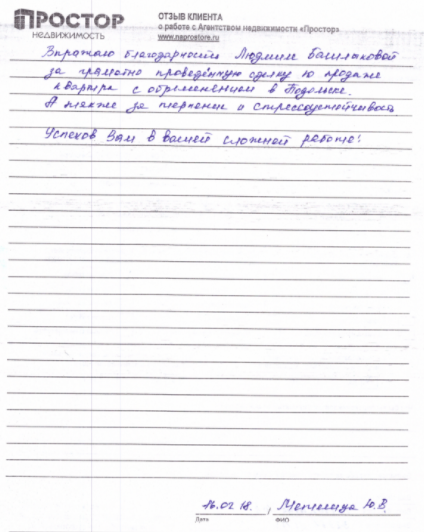 Выражаю благодарность Людмиле Башлыковой за грамотно проведенную сделку по продаже квартиры с обременением в Подольске. А так же за терпение и стреcсоустойчивость. Успехов Вам в Вашей сложной работе.