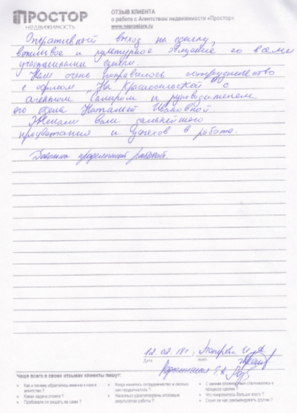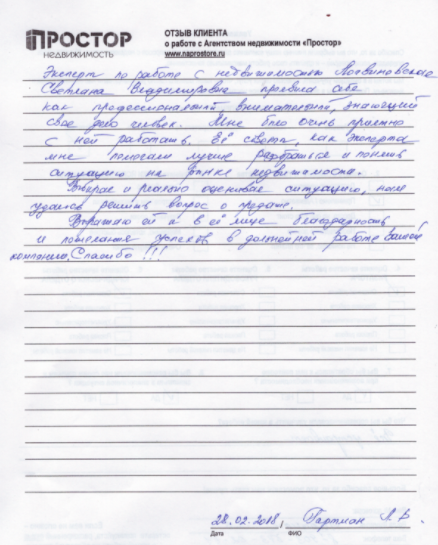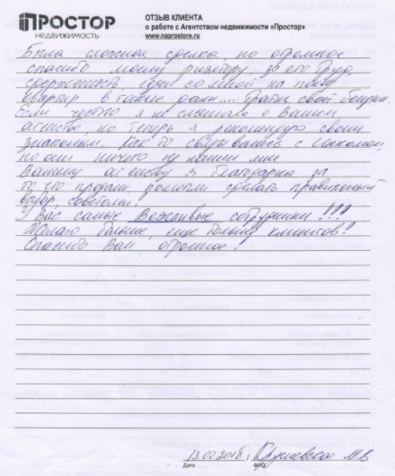 Была сложная сделка, но огромное спасибо моему риэлтору, за его труд, сдержанность, езды со мной на показ квартир в такие дали... тратил свой бензин. Если честно я не слышала о Вашем агентстве, но теперь я рекомендую своим знакомым. Как-то связывалась с Инкомом, но они ничего не нашли мне. Вашему агентству я благодарна за то, что продали, помогли сделать правильный выбор, советами. У Вас самые Вежливые сотрудники!!! Желаю больше, еще больше клиентов! Спасибо Вам огромное !