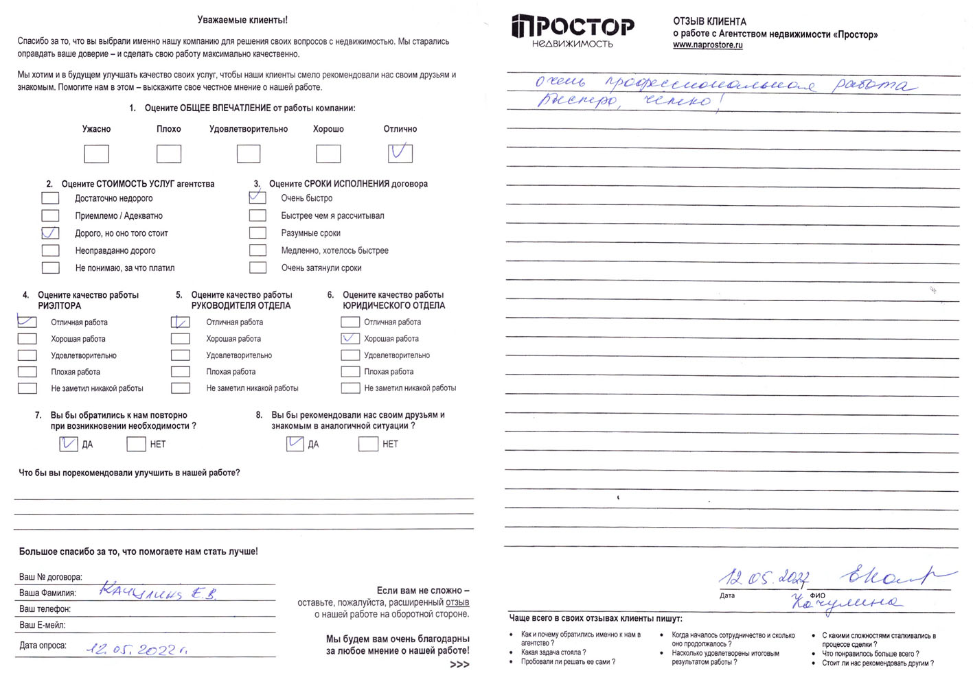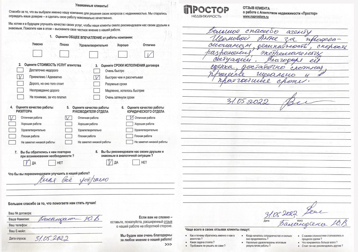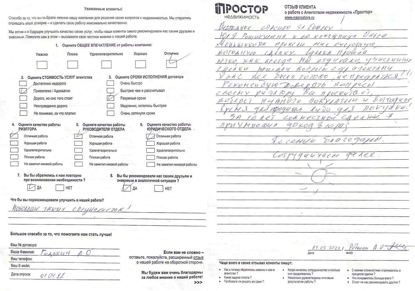 По рекомендации обратился в агентство недвижимости "Простор" с целью продажи квартиры в МО. Хочу поблагодарить сотрудников агентства Маркопольскую Евгению и Рыскину Надежду за отличную организацию процесса.