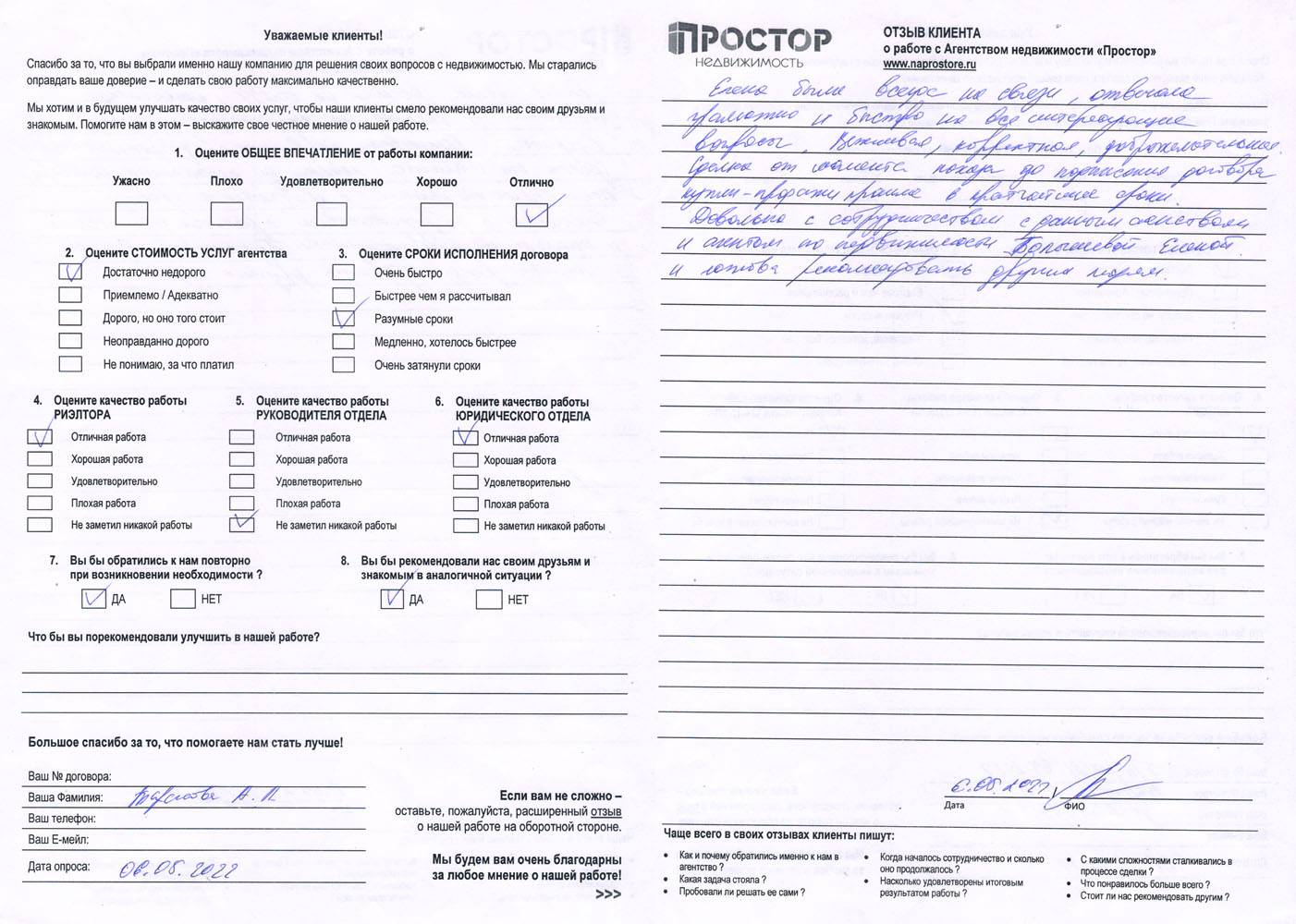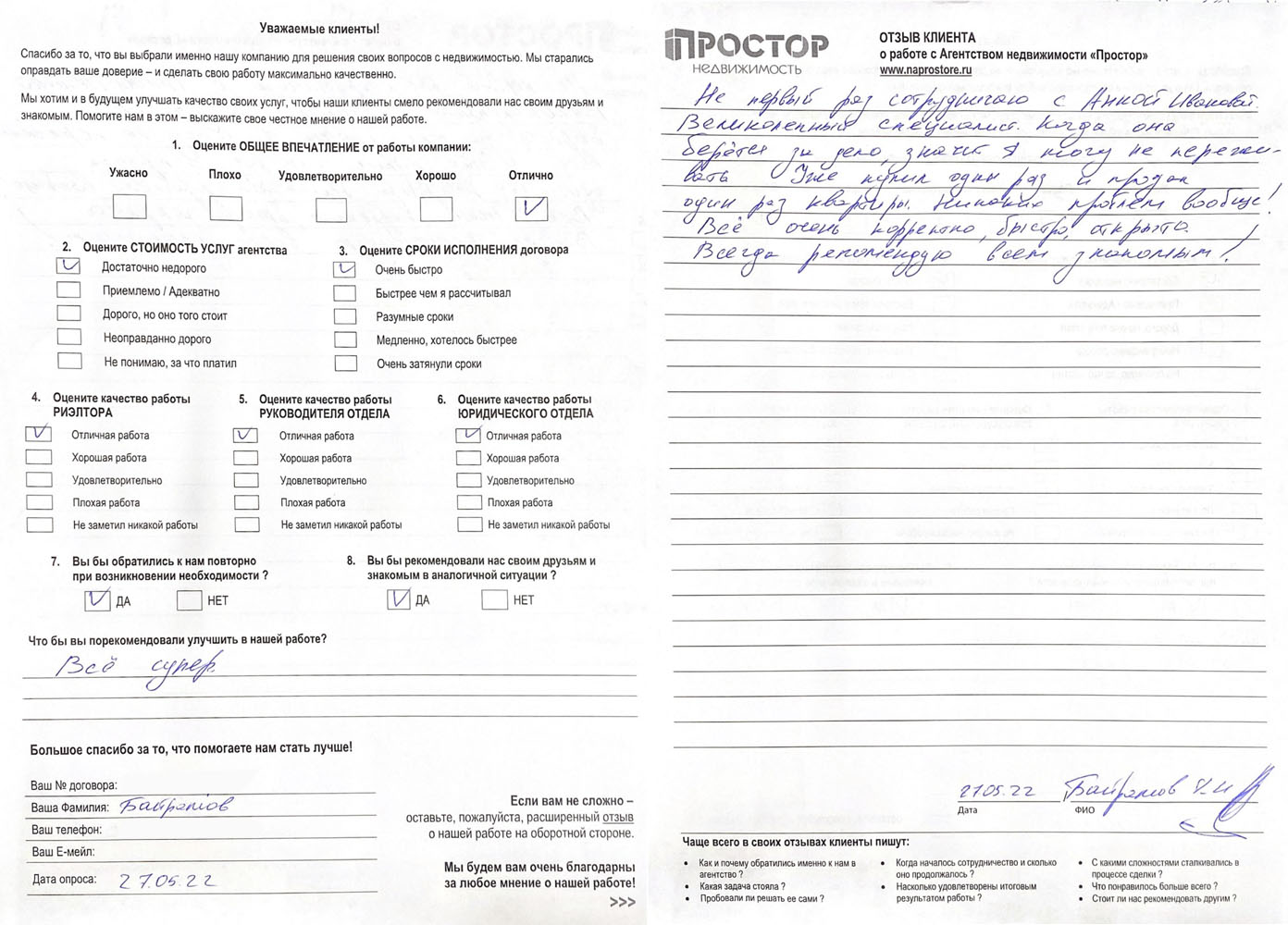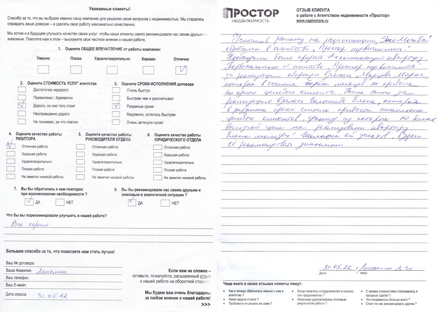 По рекомендации обратился в агентство недвижимости "Простор" с целью продажи квартиры в МО. Хочу поблагодарить сотрудников агентства Маркопольскую Евгению и Рыскину Надежду за отличную организацию процесса.
