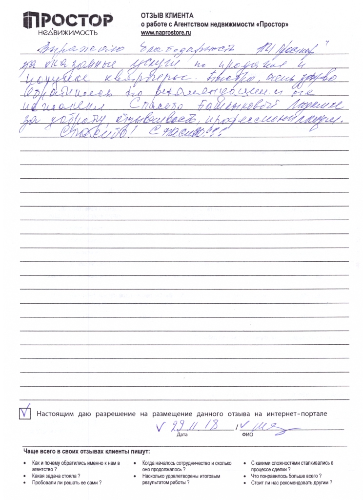 Выражаю благодарность АН "Простор" за оказанные услуги по продаже и покупке квартиры. Быстро, очень здорово. Обратились по рекомендации и не прогадали. Спасибо Башлыковой Людмиле за доброту, отзывчивость, профессионализм. Спасибо! Спасибо!