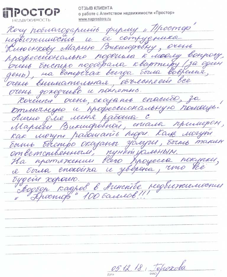 Хочу поблагодарить фирму "Простор" недвижимость и ее сотрудника Клюенкову Марию Викторовну, очень профессионально подошла к моему вопросу, очень быстро подобрала квартиру (за один день), на встречах всегда была вовремя, очень внимательная, объясняет все очень доходчиво и понятно. Хочется очень сказать спасибо за отличную и профессиональную помощь! Лично для меня работа с Марией Викторовной стала примером, как могут работать люди. Как могут быть быстро оказаны услуги, быть таким ответственным, пунктуальным. На протяжении всего процесса покупки я была спокойна и уверена, что все будет хорошо. Подбор кадров в Агентстве недвижимости "Простор" 100 баллов!!!!
