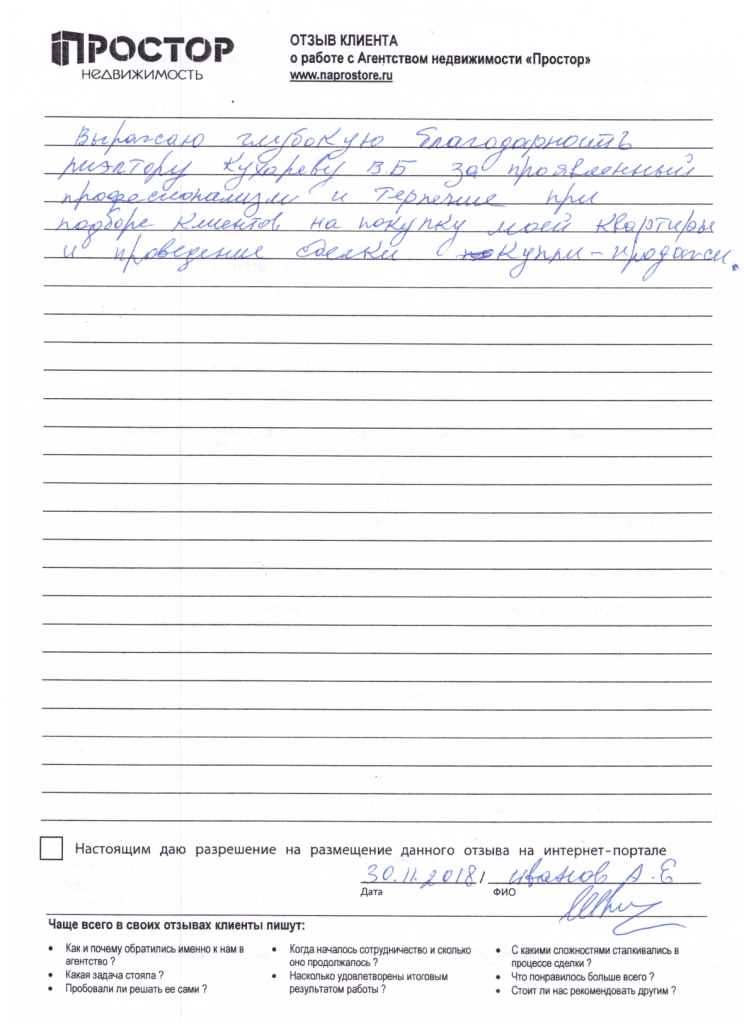 Выражаю глубокую благодарность риэлтору Кухареву В.Б. за проявленный профессионализм и терпение при подборе клиентов на покупку моей квартиры и проведение сделки купли-продажи.