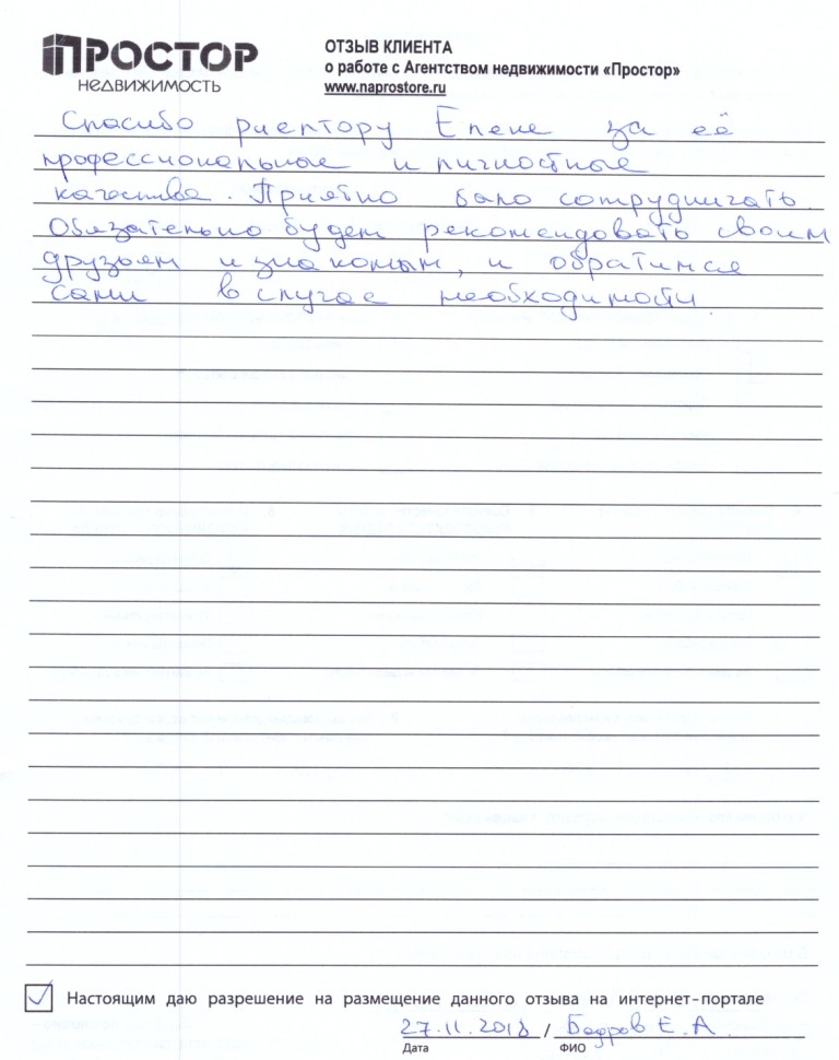 Спасибо риэлтору Елене за ее профессиональные и личные качества. Приятно было сотрудничать, обязательно будем рекомендовать своим друзьям и знакомым, и обратимся сами в случае необходимости.