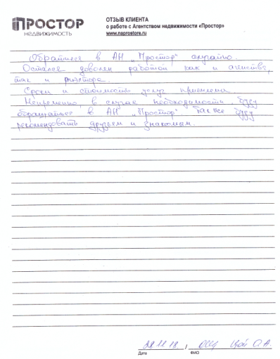 Обратился в АН "Простор" случайно. Остался доволен работой как и агентства, так и риэлтора. Сроки и стоимость услуг приемлена. Непременно, в случае необходимости, буду обращаться в АН "Простор". Также буду рекомендовать друзьям и знакомым.
