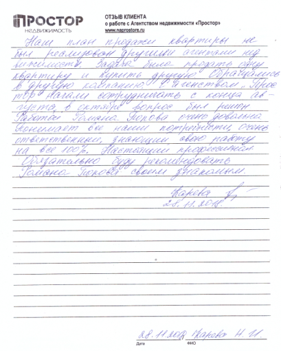 Наш план продажи квартиры не был реализован другими агентами недвижимости. Задача была продать одну квартиру и купить другую. Обращались в другую компанию. С агентством "Простор" начали сотрудничать с конца августа, в октября вопрос был решен. Работой Романа Попова очень довольна. Понимает все наши потребности, очень ответственный, знающий свою работу на все 100%. Настоящий профессионал. Обязательно буду рекомендовать Романа Попова своим знакомым.