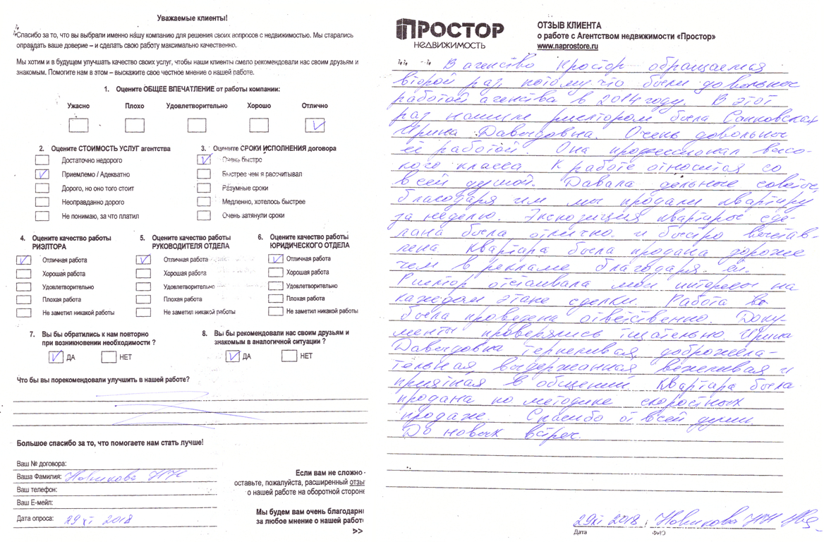 В агентство АН "Простор" обращаемся второй раз, потому, что были довольны работой агентства в 2014 году. В этот раз нашим агентом была Санковская Ирина Давидовна. Очень довольны ее работой. Она профессионал высокого класса. К работе относится со всей душой. Давала дельные советы, благодаря им мы продали квартиру за неделю. Экспозиция квартиры сделана была отлично и быстро выставлена в рекламу. Квартира была продана дороже, чем в рекламе, благодаря ей. Риэлтор отстаивала мои интересы на каждом этапе сделки. Работа была проведена ответственно. Документы проверялись тщательно. Ирина Давидовна терпеливая, доборожелательная, выдержанная, вежливая и приятная в общении. Квартира была продана по методике скоростных продаж. Спасибо от всей души. До новых встреч.