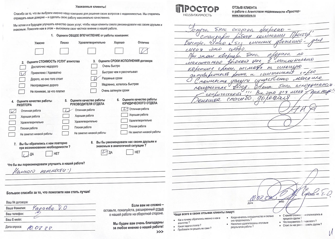 По рекомендации обратился в агентство недвижимости "Простор" с целью продажи квартиры в МО. Хочу поблагодарить сотрудников агентства Маркопольскую Евгению и Рыскину Надежду за отличную организацию процесса.