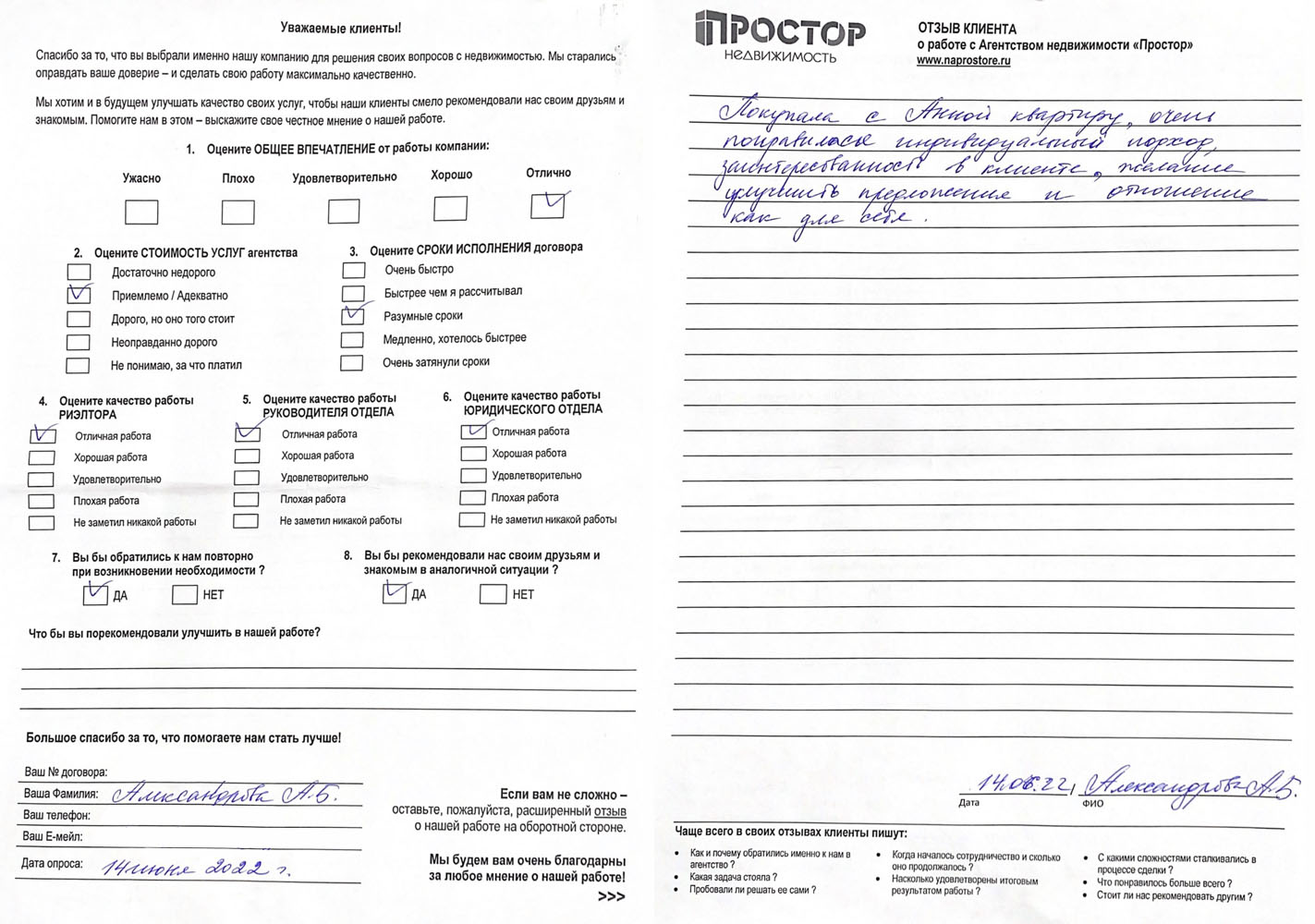 Услуга была оказана прекрасно - стандарт работы компании Простор! Быстро, четко и без лишних движений - для меня это ценно. При этом квартира была продана по максимально высокой цене, в максимально короткие сроки, не смотря на сильную затоваренность рынка и сниженный спрос. Стоимость услуги существенно меньше полученных выгод. А еще была неподдельная сопричастность! Все это для меня - как надо! Большое спасибо, дорогая Аня.