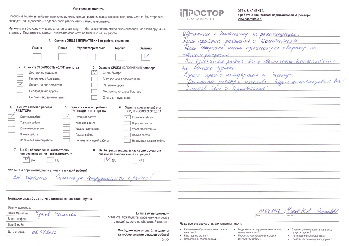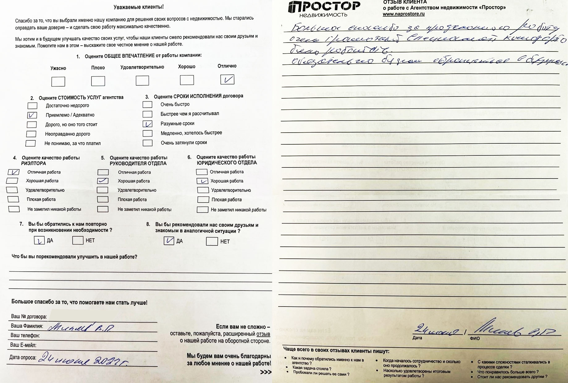 Повторно обратился к АН «Простор», снова все прошло хорошо и я доволен тем, как проходил весь процесс по продаже квартиры. Спасибо Ольге Меньшиковой и Юлии Рощикулиной за проведенную работу! Все прошло быстро, динамично и всегда в контакте по всем вопросам, отдельный большой плюс, что окончательная стоимость продажи получилась даже чуть больше предполагаемой сначала!