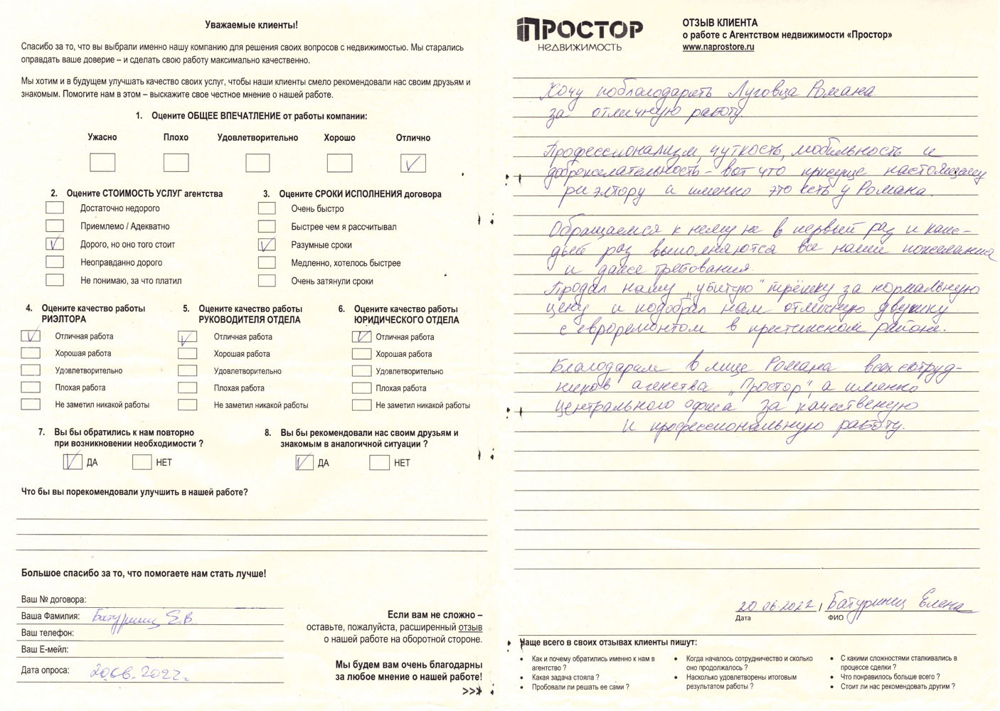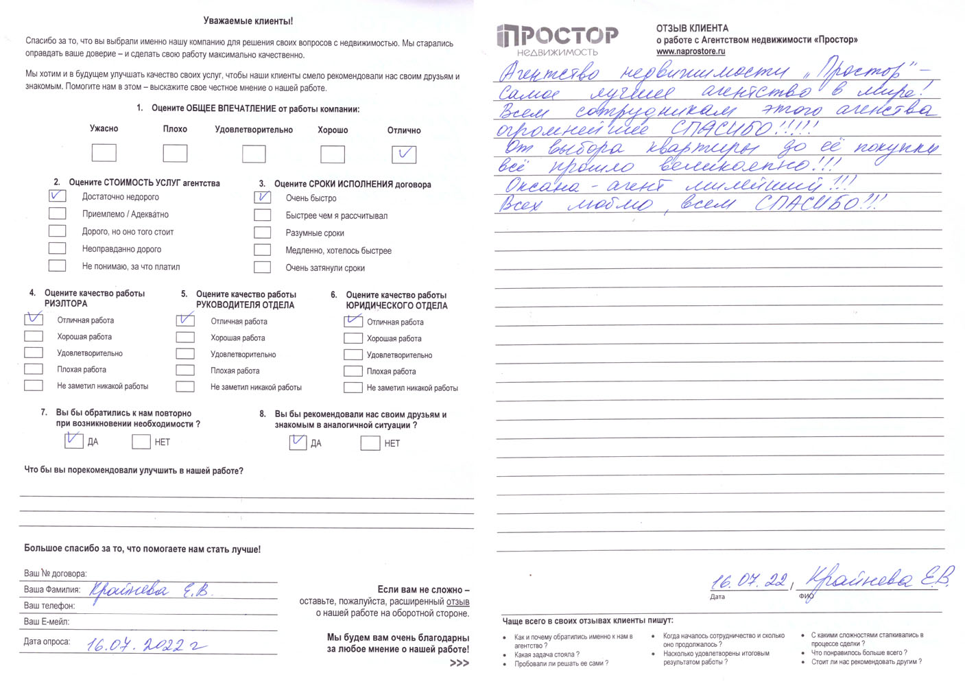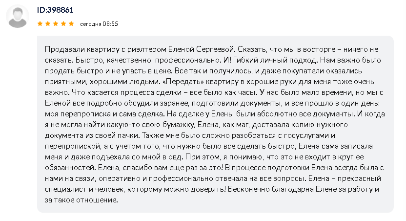 Продавали квартиру с агентством «Простор», риэлтер – Елена. Сказать, что мы в восторге – ничего не сказать. Быстро, качественно, профессионально. И! Гибкий личный подход. Нам важно было продать быстро и не упасть в цене. Все так и получилось, и даже покупатели оказались приятными, хорошими людьми. «Передать» квартиру в хорошие руки для меня тоже очень важно. Что касается процесса сделки – все было как часы. У нас было мало времени, но мы с Еленой все подробно обсудили заранее, подготовили документы, и все прошло в один день: моя перепрописка и сама сделка. На сделке у Елены были абсолютно все документы. И когда я не могла найти какую-то свою бумажку, Елена, как маг, доставала копию нужного документа из своей пачки. Также мне было сложно разобраться с госуслугами и перепропиской, а с учетом того, что нужно было все сделать быстро, Елена сама записала меня и даже подъехала со мной в ОВД. При этом, я понимаю, что это не входит в круг ее обязанностей. Елена, спасибо вам еще раз за это! В процессе подготовки Елена всегда была с нами на связи, оперативно и профессионально отвечала на все вопросы. Елена – прекрасный специалист и человек, которому можно доверять! Бесконечно благодарна Елене за работу и за такое отношение.