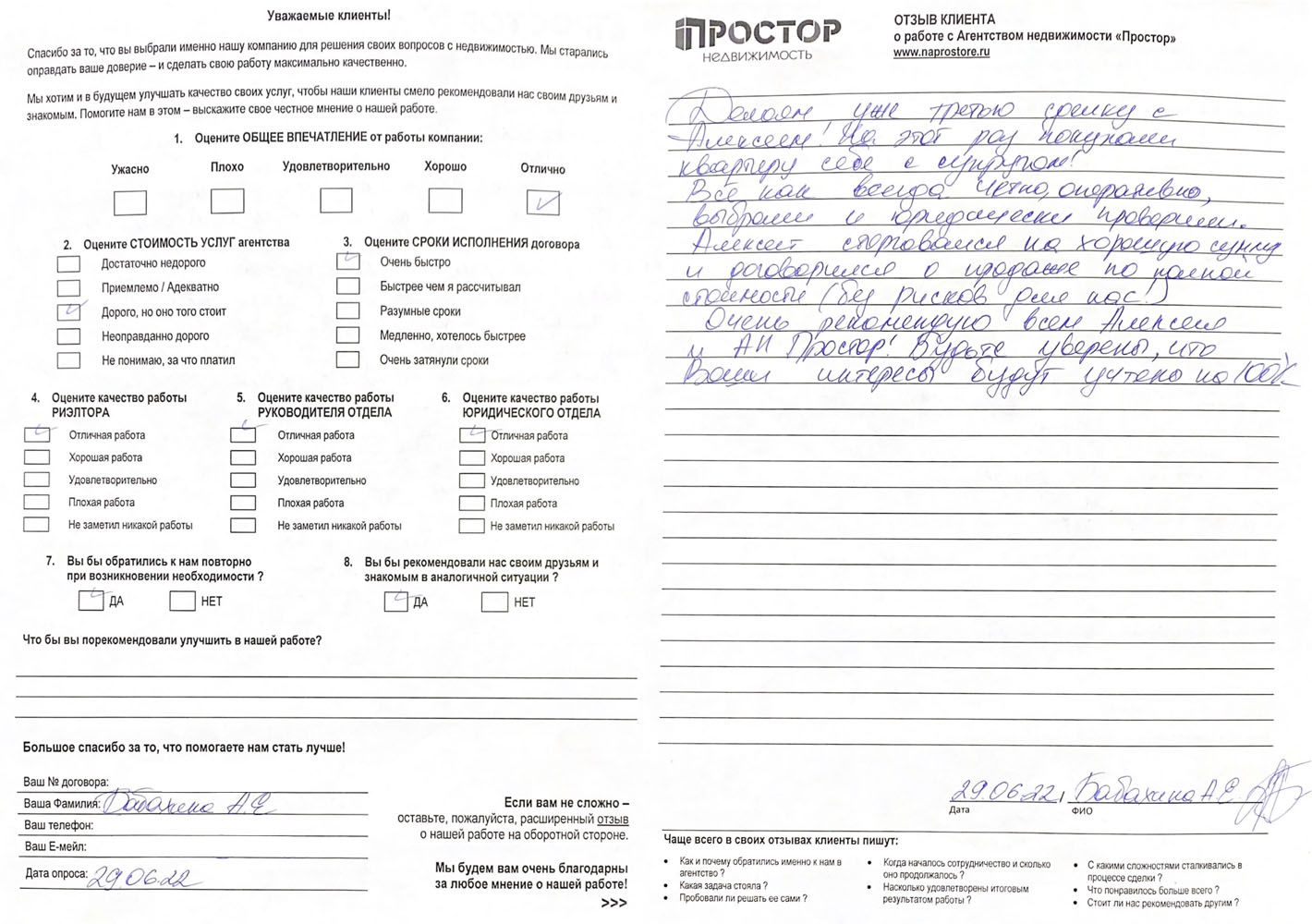 Делаем уже третью сделку с Алексеем! На этот раз покупали уже квартиру себе с супругом. Все как всегда четко, оперативно, выбрали и юридически проверили. Алексей сторговался на хорошую сумму и договорился о продаже по полной стоимости (без рисков для нас). Очень рекомендую всем Алексея и АН "Простор". Будьте уверены, что Ваши интересы будут учтены на 100%.