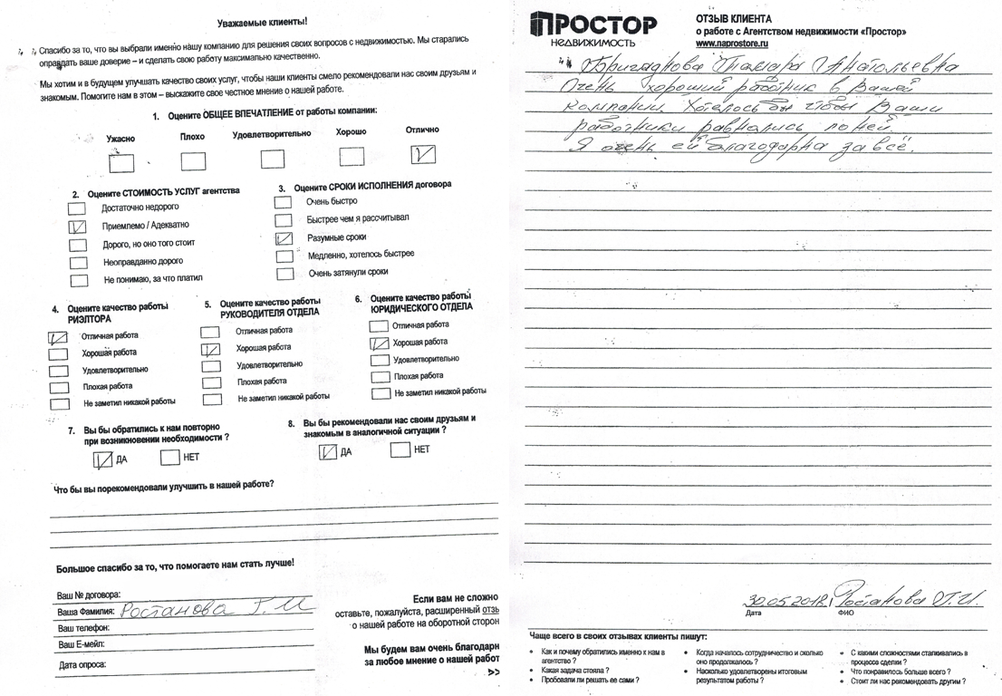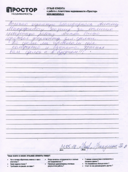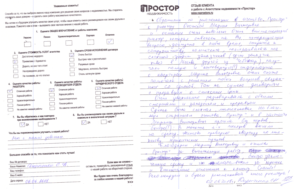 Обратились по рекомендации в агентство "Простор" к риэлтору Охотской Марине Викторовне и остались очень довольны. Очень внимательный риэлтор, которая отвечает на все интересующие вопросы, доступна в любое время, открыта к сотрудничеству, компетентна, подстраивалась под сложный график заказчиков (один заказчик живет в Москве, другой из Чебоксар), получали полную и достоверную (!) информацию о квартирах. Марина Викторовна очень охотно помогала с решением любых вопросов, связанных со сделкой. Так же сумела договориться с продавцом о снижении цены. Очень уважительно разговаривала с обеими сторонами и заказчиком, и продавцом. Сделка была сложная, многоходовая, но балгодаря стараниям агентства "Простор" и в частности Марины Викторовны прошла без нервов, быстро (!). В течение 2-м месяцев вышли на сделку. Агентство проверяет квартиру по множеству юридических пунктов. Благодарим Марину Викторовну и агентство "Простор" за выполненную работу, быстро заключенную сделку и что немаловажно за хорошее и внимательное отношение к клиенту. Спасибо! Рекомендуем и будем рекомендовать этого риэлтора!