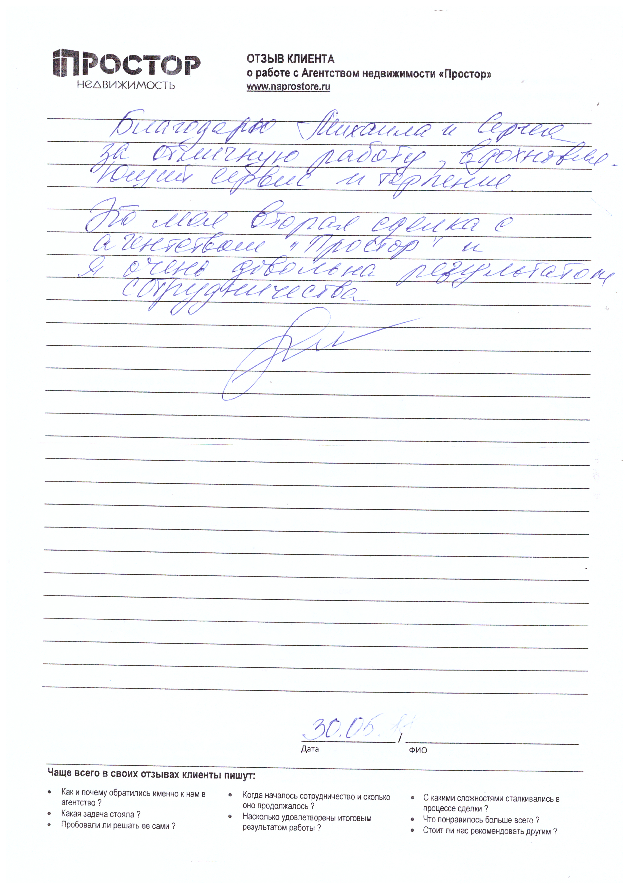 Благодарю Михаила и Сергея за отличную работу, вдохновляющий сервис и терпение. Это моя вторая сделка с агентством "Простор" и я очень довольна результатом сотрудничества.