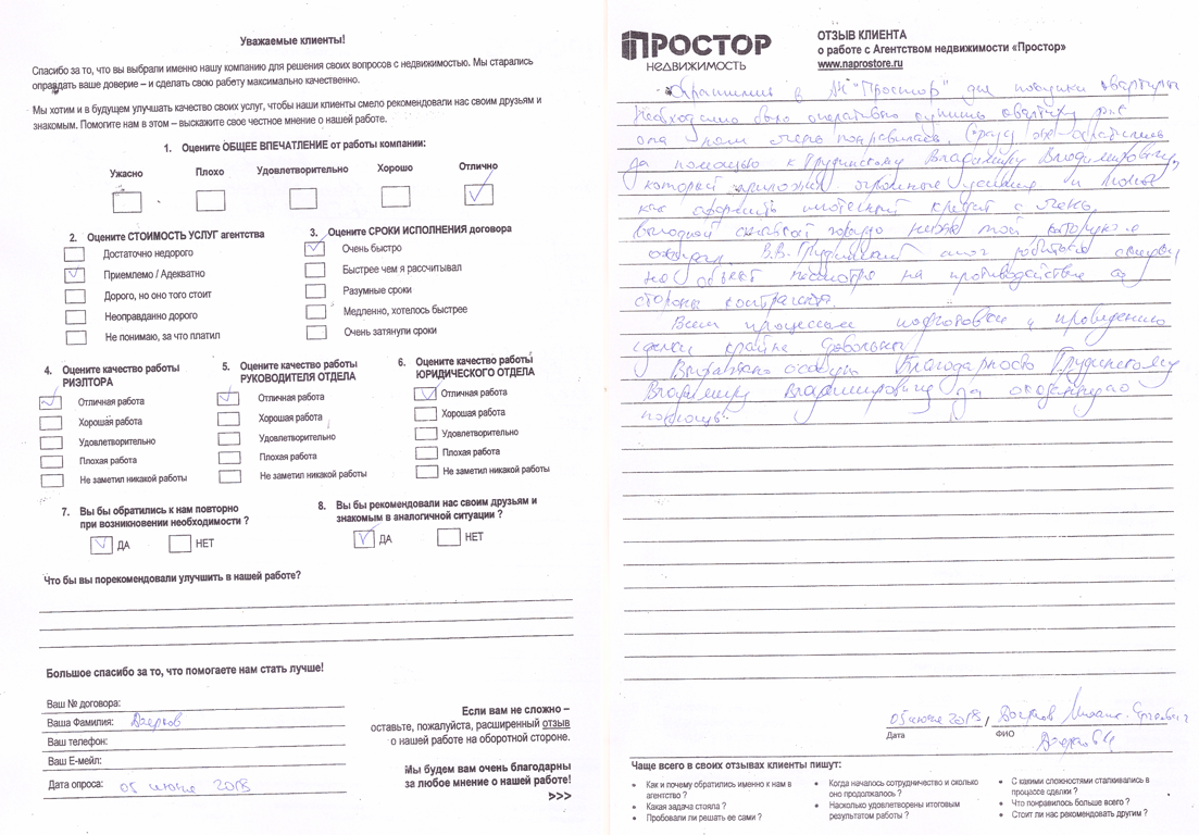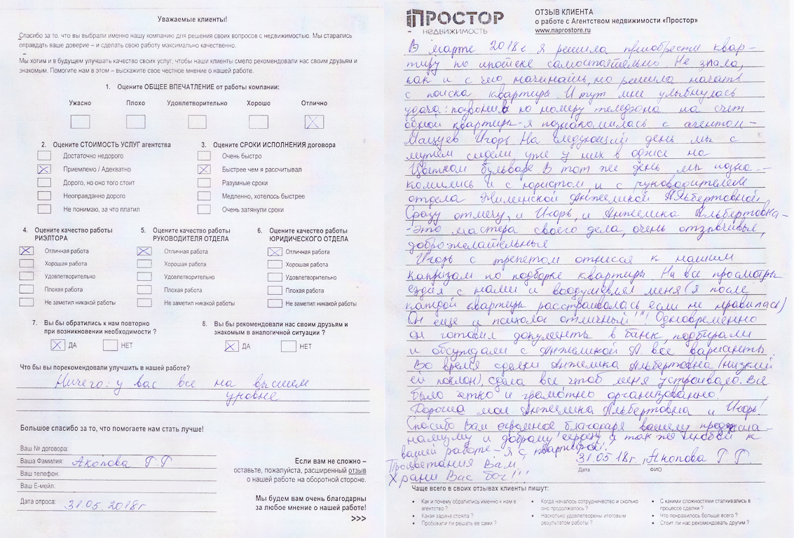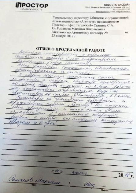 Выражаю благодарность и огромное человеческое спасибо Елене Владимировне Паничкиной (офис Таганский). Очень грамотный специалист, ответственная, организованная и тактичная. В марте 2018 года состоялась сделка по продаже и покупке квартиры одновременно, очень боялись не успеть, но Елена работала оперативно, сопровождала везде: на просмотрах, на сделке, у нотариуса, в банке. Благодаря ее грамотным действиям и юридической службы "Простор" все ступени были преодолены, и наша семья стала обладателем 2-й комнатной квартиры рядом с метро, все сложилось наилучшим образом и в срок.