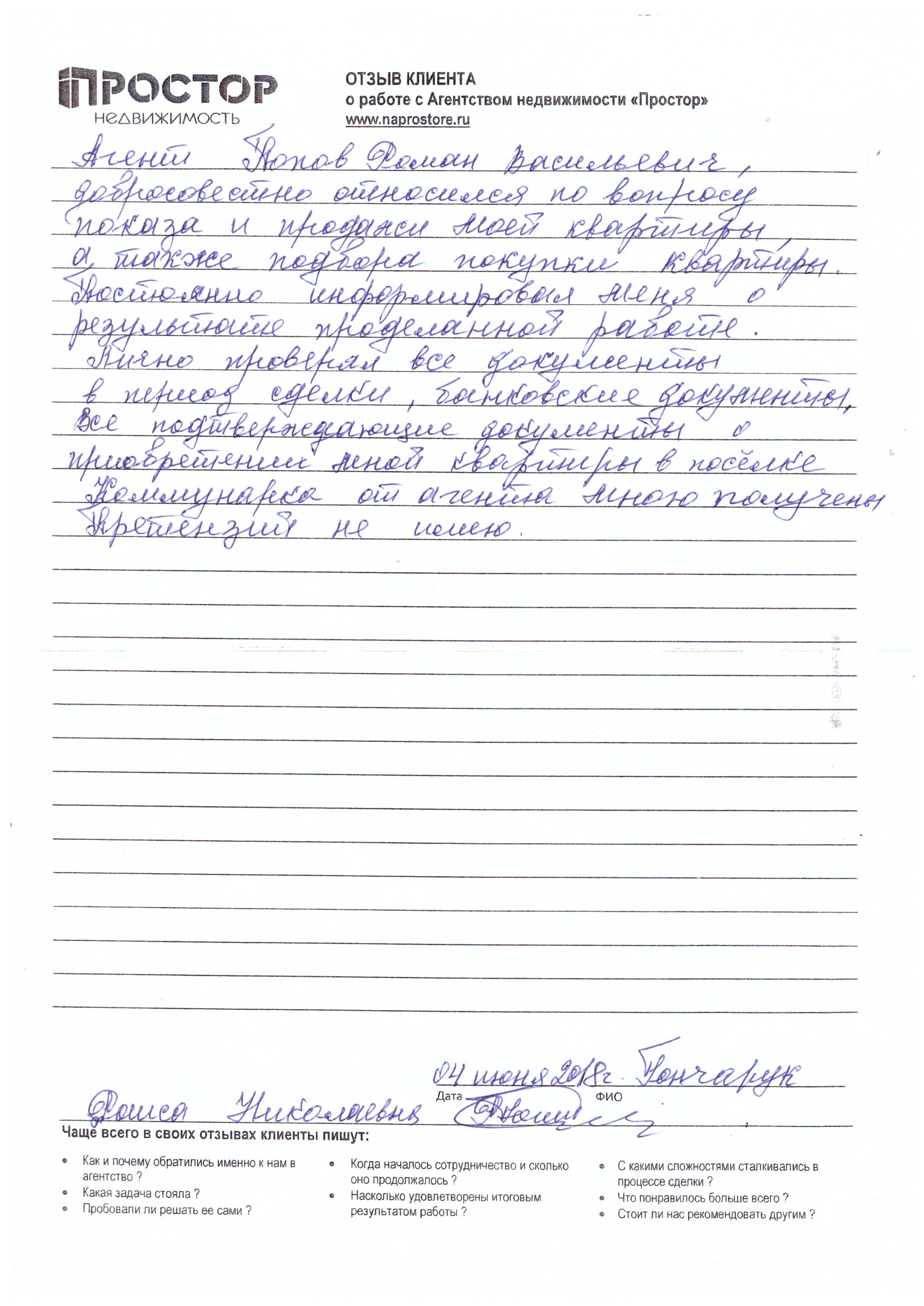 Агент Попов Роман Васильевич, добросовестно относился по вопросу показа и продажи моей квартиры, а также подбора покупки квартиры. Постоянно информировал меня о результате проделанной работы. Лично проверял все документы в период сделки, банковские документы, все подтверждающие документы о приобретении мной квартиры в поселке Коммунарка от агента мною получены. Претензий не имею.