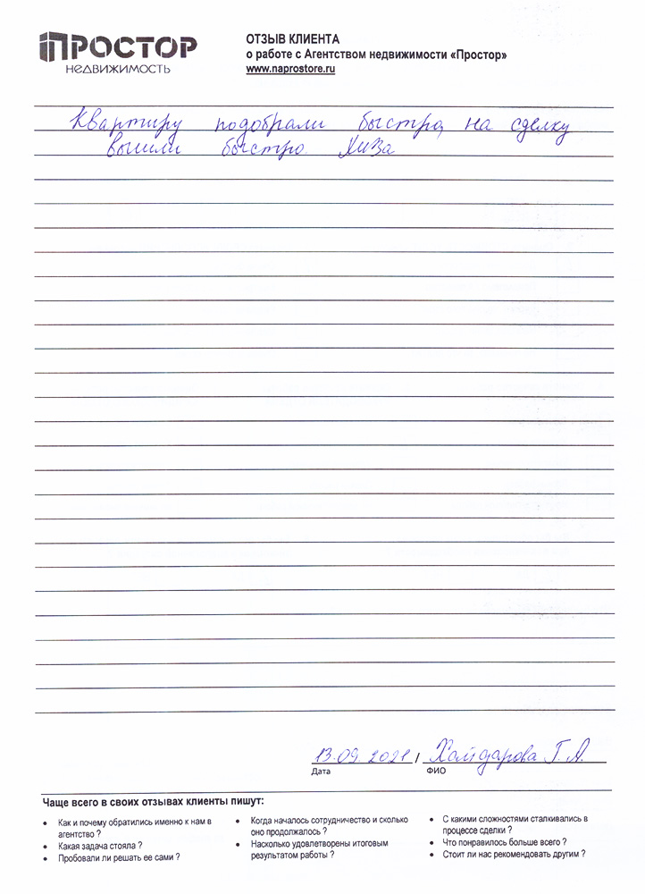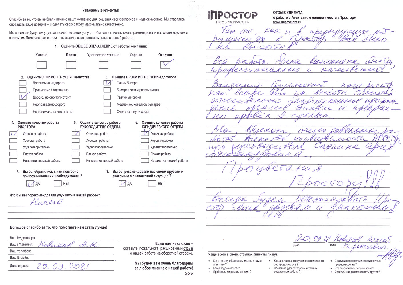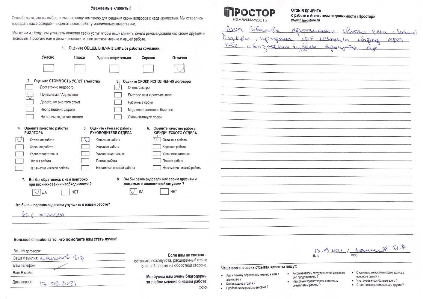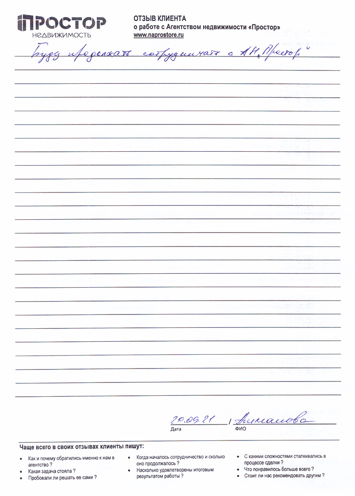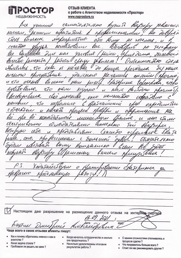 Работа очень понравилась Ратновской Надежды Валентиновны, все выполнено на высоком профессиональном уровне и в короткий срок. Сложные вопросы решались оперативно и качественно. Большое спасибо руководству и всему коллективу. Буду обращаться только в это агенство и рекомендую знакомым. С благодарностью к АН "Простор"