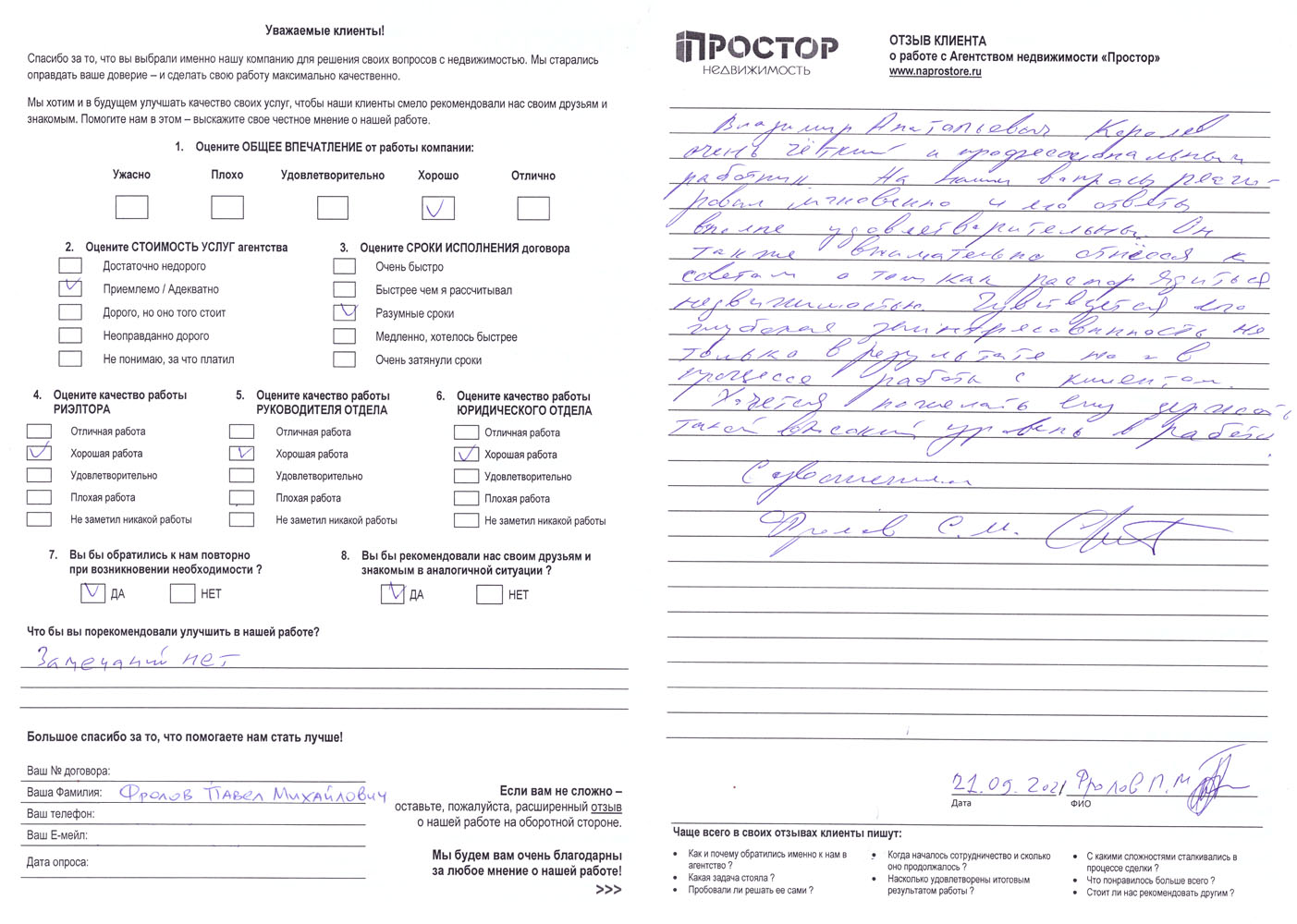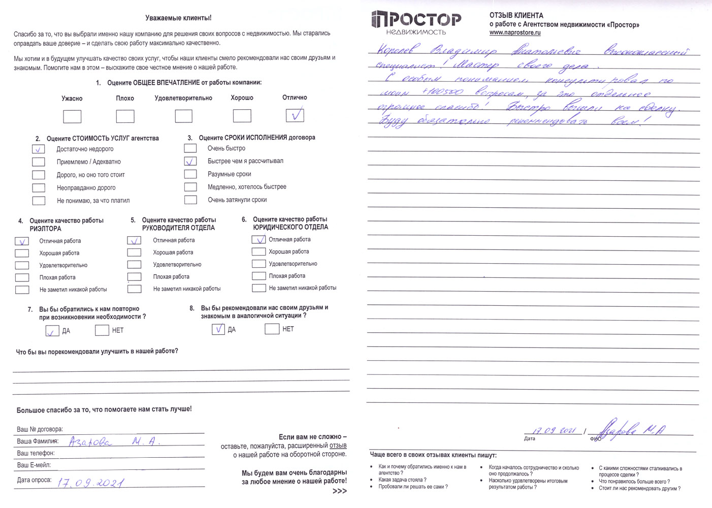 Повторно обратился к АН «Простор», снова все прошло хорошо и я доволен тем, как проходил весь процесс по продаже квартиры. Спасибо Ольге Меньшиковой и Юлии Рощикулиной за проведенную работу! Все прошло быстро, динамично и всегда в контакте по всем вопросам, отдельный большой плюс, что окончательная стоимость продажи получилась даже чуть больше предполагаемой сначала!