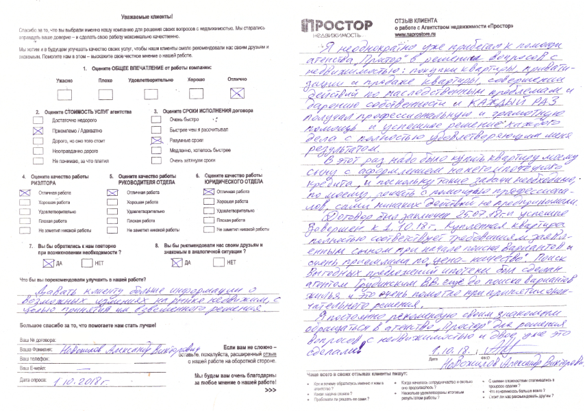 Я неоднократно уже прибегал к помощи агентства "Простор" в решении вопросов с недвижимостью: покупки квартиры, приватизации и продажи квартиры, совершении действий по наследственным проблемам и дарению собственности и КАЖДЫЙ РАЗ получал профессиональную и грамотную помощь и успешное решение каждого дела с полностью удовлетворяющим меня результатом. В этот раз надо было купить квартиру моему сыну с оформлением на него ипотечного кредита и, поскольку такие задачи необходимо, по-моему, решать с помощью профессионалов, сами никаких действий не предпринимали. Договор был заключен 25.07.2018 г. и успешно завершен к 01.10.2018 г. Купленная квартира полностью соответствует требованиям, заявленным сыном при начале поиска вариантов, и очень приемлема по соотношению цена-качество. Поиск выгодных предложений ипотеки был сделан агентом Грудинским В.В. еще до поиска вариантов жилья, и это очень помогло при принятии окончательного решения. Я постоянно рекомендую своим знакомым обращаться в агентство "Простор" для решения вопросов с недвижимостью, и двое уже это сделали!