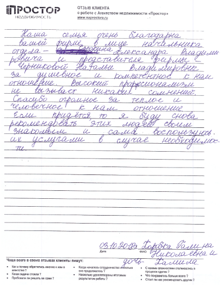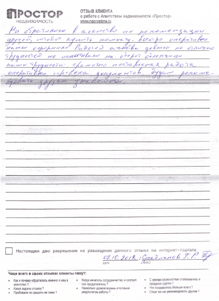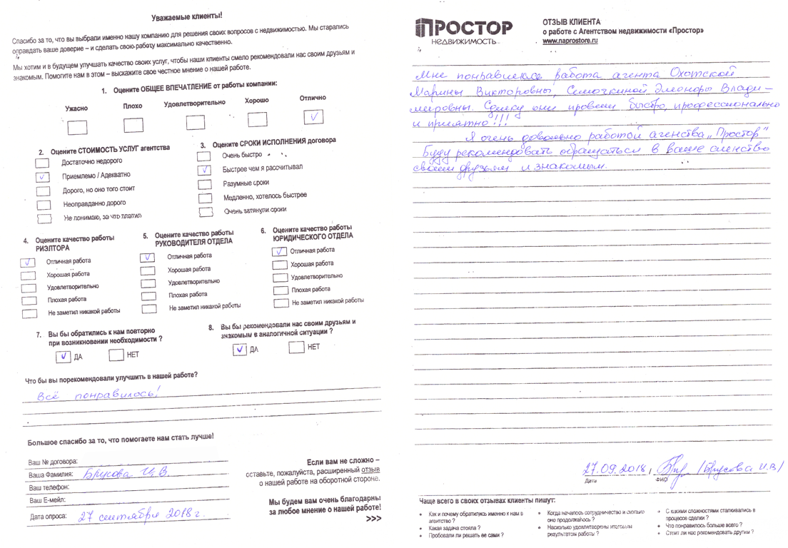 По рекомендации обратился в агентство недвижимости "Простор" с целью продажи квартиры в МО. Хочу поблагодарить сотрудников агентства Маркопольскую Евгению и Рыскину Надежду за отличную организацию процесса.