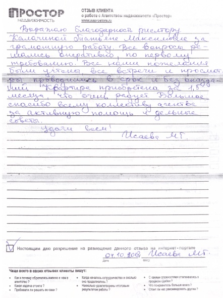 Выражаю благодарность риэлтору Калачиной Татьяне Максимовне за грамотную работу. Все вопросы решались оперативно, по первому требованию. Все наши пожелания были учтены, все встречи и просмотры проводились в срок и без опозданий. Квартира приобретена за 1,5 месяца, что очень радует. Большое спасибо всему коллективу агентства за активную помощь и дельные советы. Удачи всем!