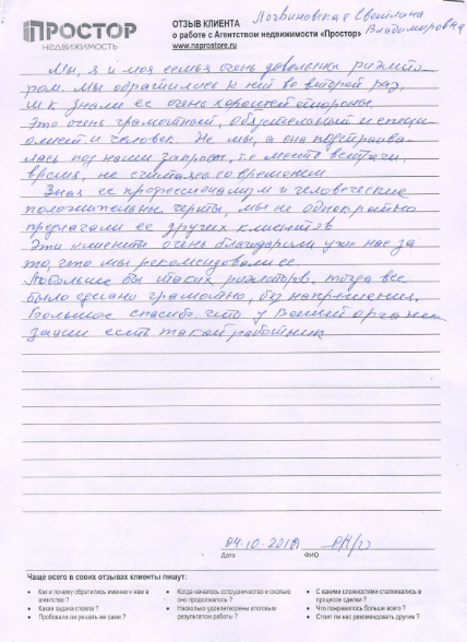 Мы, я и моя семья очень довольны риэлтором Логвиновской Светланой Владимировной. Мы обратились к ней во второй раз, т.к. знаем ее с очень хорошей стороны. Это очень грамотный, обязательный и специалист, и человек. Не мы, а она подстраивалась под наши запросы, т.е. место встречи, время, не считаясь со временем. Зная ее профессионализм и человеческие положительные черты, мы не однократно предлагали ей других клиентов. Эти клиенты благодарили уже нас за то, что мы рекомендовали ее. Побольше бы таких риэлторов, тогда все было сделано грамотно, без напряжения. Большое спасибо, что у Вашей организации есть такой работник.