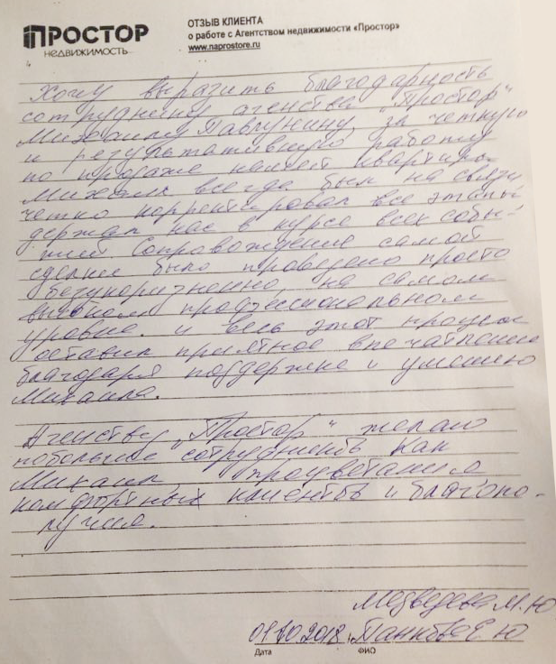 Хочу выразить благодарность сотруднику агентства "Простор" Михаилу Павлунину за четкую и результативную работу по продаже нашей квартиры. Михаил всегда был на связи, четко корректировал все этапы, держал нас в курсе всех событий. Сопровождение самой сделки было проведено просто безукоризненно, на самом высоком профессиональном уровне, и весь этот процесс оставил приятное впечатление благодаря поддержке и умению Михаила. Агентству "Простор" желаю побольше сотрудников, как Михаил, процветания, комфортных клиентов и благополучия.