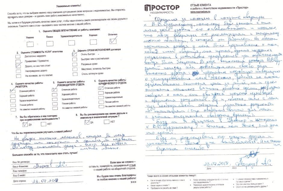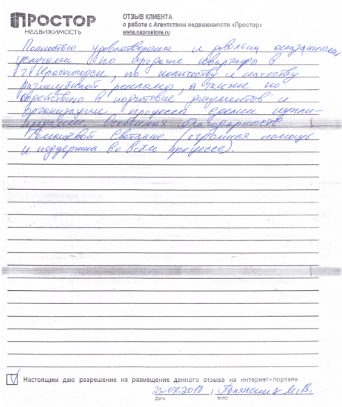 Повторно обратился к АН «Простор», снова все прошло хорошо и я доволен тем, как проходил весь процесс по продаже квартиры. Спасибо Ольге Меньшиковой и Юлии Рощикулиной за проведенную работу! Все прошло быстро, динамично и всегда в контакте по всем вопросам, отдельный большой плюс, что окончательная стоимость продажи получилась даже чуть больше предполагаемой сначала!