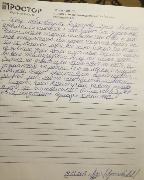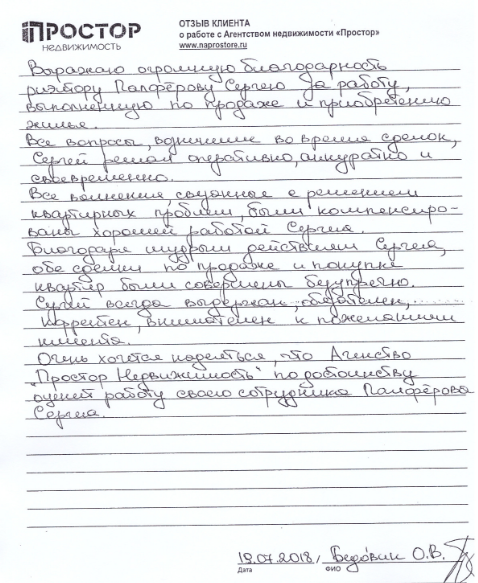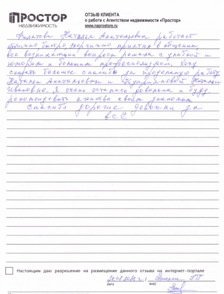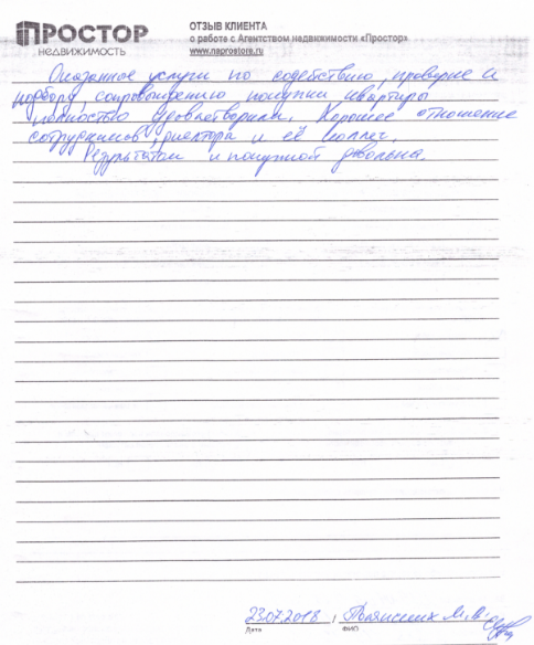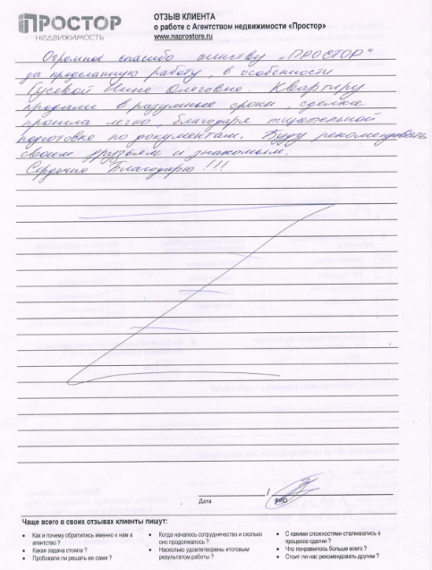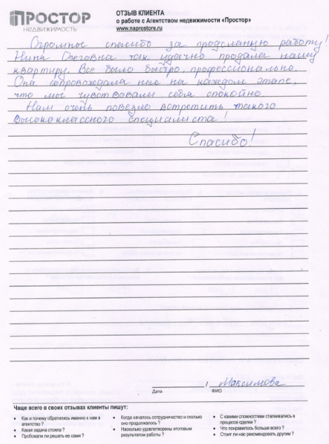 Огромное спасибо агентству « ПРОСТОР» за проделанную работу, в особенности Гусевой Нине Олеговне. Квартиру продали в разумные сроки, сделка прошла легко, благодаря тщательной подготовке по документам. Буду рекомендовать своим друзьям и знакомым. Сердечно Благодарю!!!