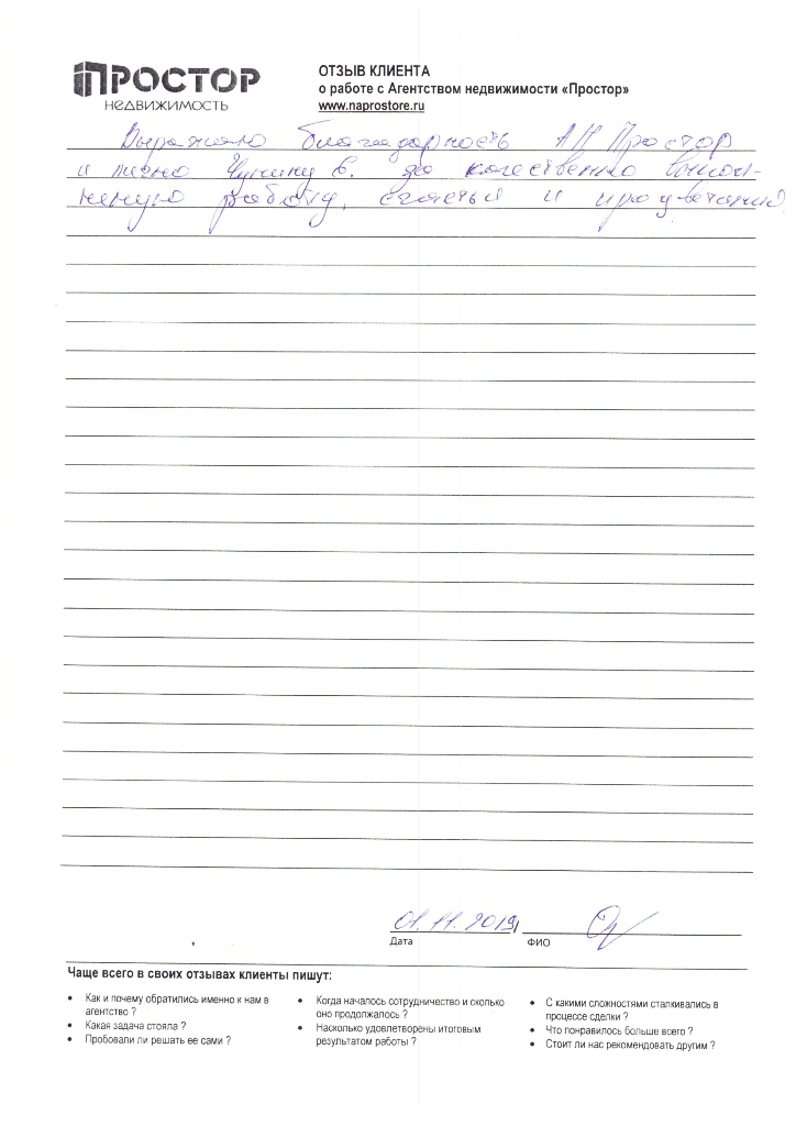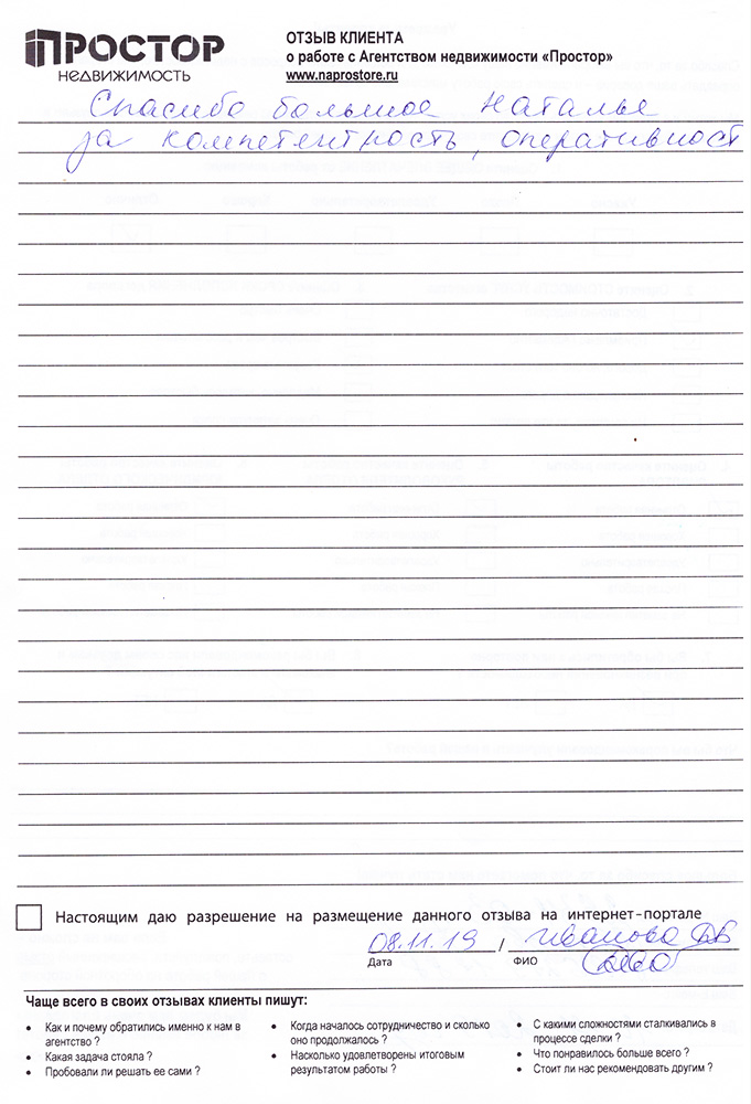 Я, Климова Татьяна Александровна, клиентка вашего агентства "Простор-недвижимость". Хочу выразить благодарность агентству за профессиональную работу и чуткое отношение к своим клиентам. Особо хочу поблагодарить вашего сотрудника Семахину Ларису, профессиональной работой которой я очень довольна. Благодаря ее работе я выгодно продала и выгодно купила недвижимость. Ее умение правильно вести дела, дало возможность мне приобрести то жилье, которое мне очень нравится, при этом я затратила минимум средств из имеющихся у меня для покупки. Спасибо большое. Желаю вашему агентству процветания. Буду рекомендовать его своим знакомым. Особенно такого специалиста, как Семахина Лариса.
