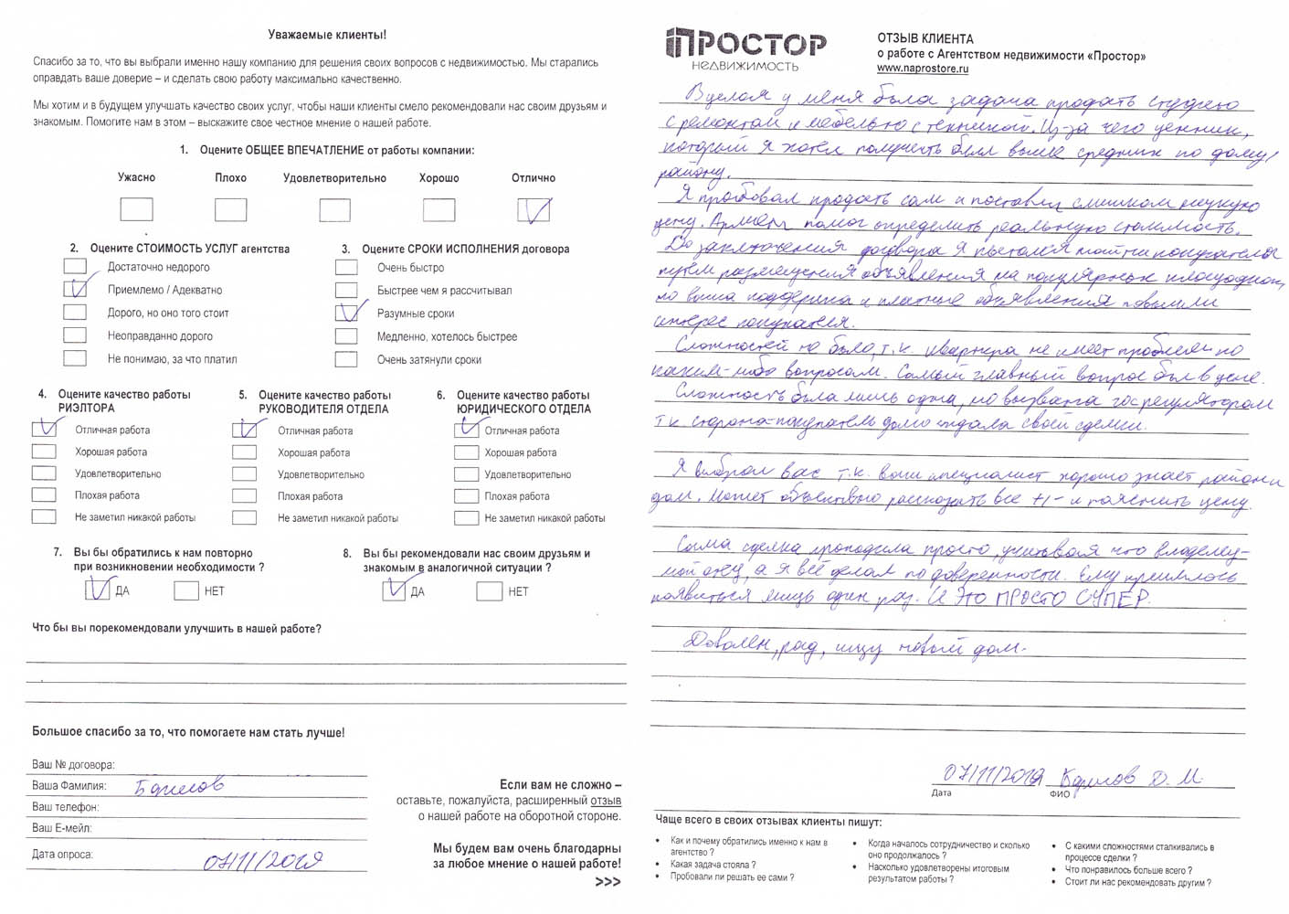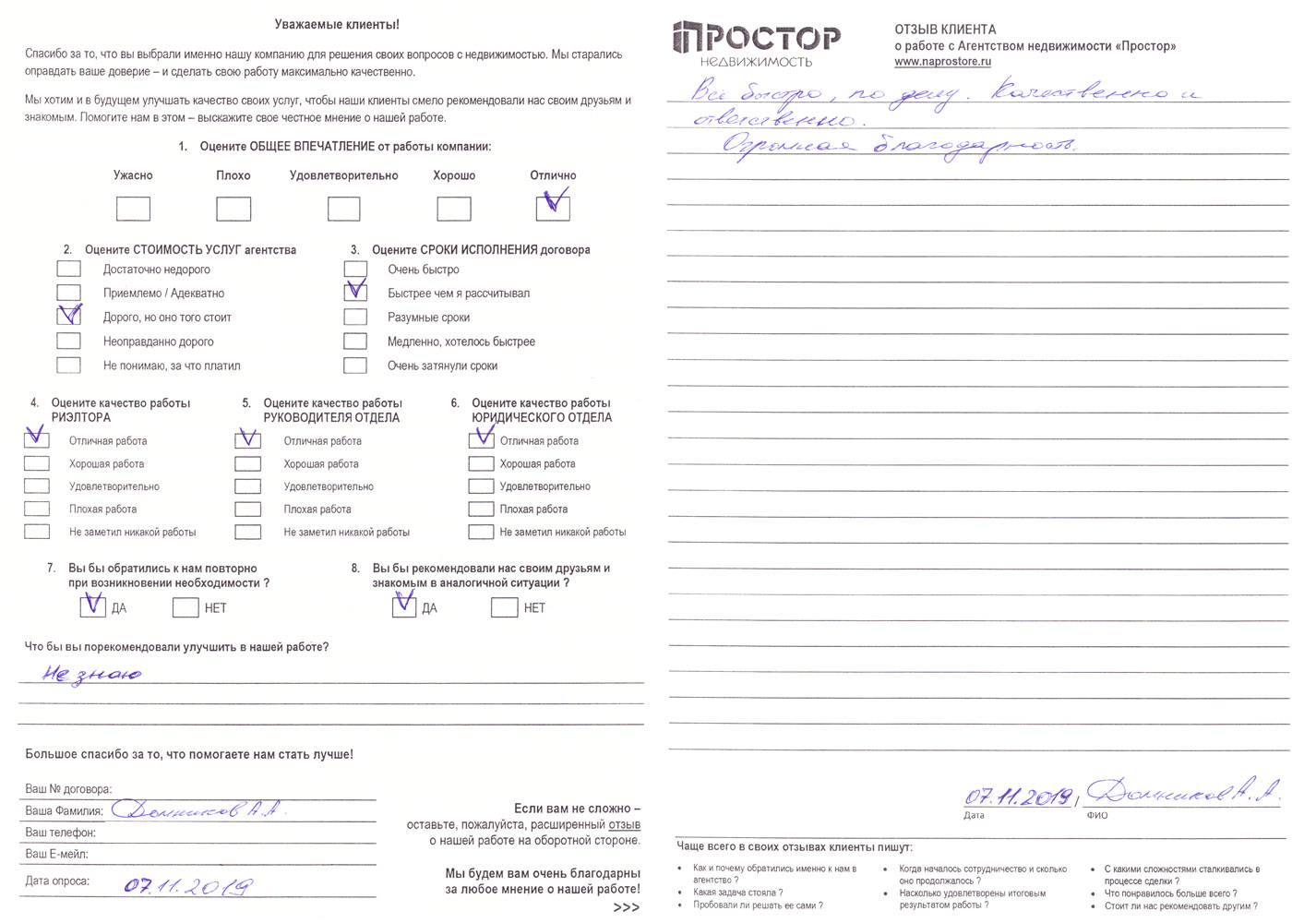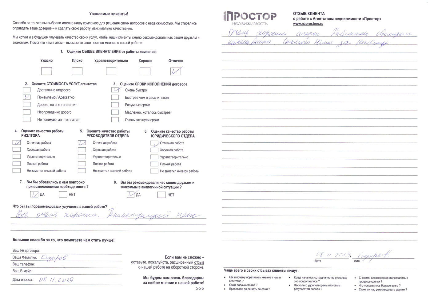 Я, Перов Михаил Германович, и моя дочь, Перова Ксения Михайловна, обращались в фирму "Простор". Продавали и покупали квартиры. И очень рады, что обратились именно в эту фирму. Помогал нам очень профессиональный, внимательный менеджер Игорь Борисович Решетов. Он предлагал нам различные варианты по подбору квартир с учётом наших пожеланий. Аккуратно и чётко оформлялись документы на квартиры, и не было проблем с переводом денег. На всех этапах проведения сделки Игорь Борисович присутствовал лично и контролировал процесс. На все интересующие нас вопросы по сделке мы получали грамотные ответы. Было очень приятно работать с таким интеллигентным, знающим человеком, вызывающим доверие с первого знакомства. Спасибо фирме "Простор", что у Вас работают такие умные и отзывчивые люди, как Игорь Борисович Решетов. У нас был "тяжёлый" случай с продажей и покупкой квартиры, но он помог решить нашу проблему. Даже не ожидали, что всё получится так быстро. Очень ему благодарны. Обязательно будем рекомендовать нашим друзьям и знакомым обращаться в фирму "Простор", особенно к менеджеру Игорю Борисовичу Решетову.