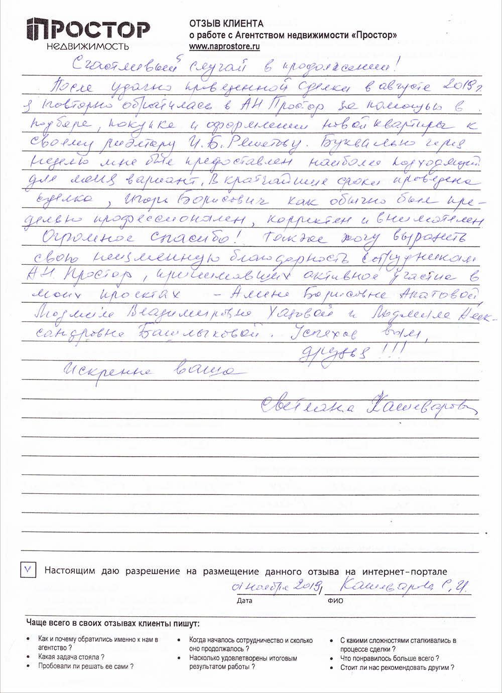 Счастливый случай в продолжении! После удачно проведённой сделки в августе 2019 г. я повторно обратилась в АН "Простор" за помощью в подборе, покупке и оформлении новой квартиры к своему риэлтору И.Б. Решетову. Буквально через неделю мне был предоставлен наиболее подходящий для меня вариант. В кротчайшие сроки проведена сделка, Игорь Борисович, как обычно, был предельно профессионален, корректен и внимателен. Огромное спасибо! Также хочу выразить свою неизменную благодарность сотрудникам АН "Простор" принимавших активное участие в моих проектах - Алине Борисовне Апатовой, Людмиле Владимировне Хазовой и Людмиле Александровне Башлыковой. Успехов вам, друзья!