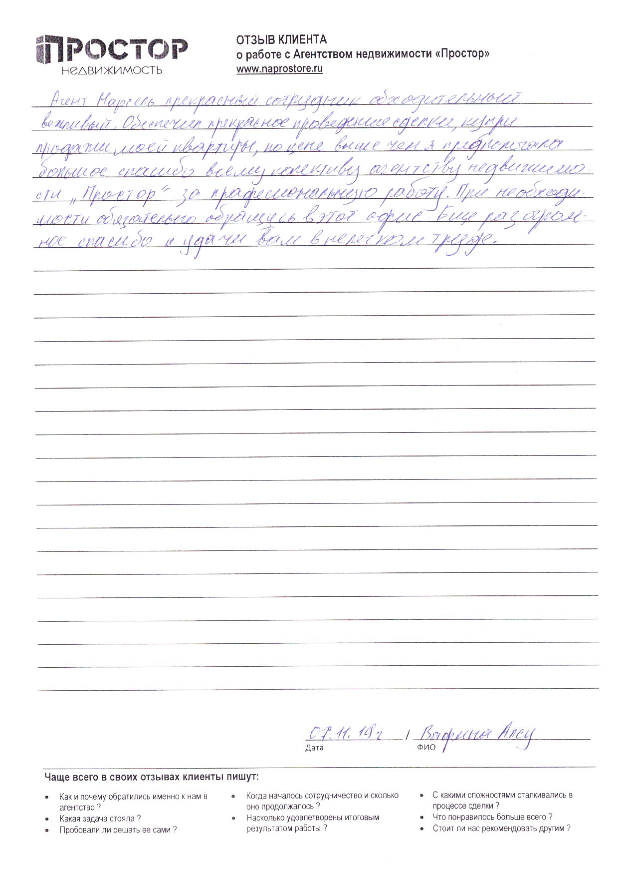 Агент Марсель - прекрасный сотрудник, обходительный, вежливый. Обеспечил прекрасное проведение сделки купли-продажи моей квартиры по цене выше, чем я приобретала. Большое спасибо всему коллективу агентства недвижимости "Простор" за профессиональную работу. При необходимости обязательно обращусь в этот офис. Еще раз огромное спасибо и удачи вам в нелегком труде.
