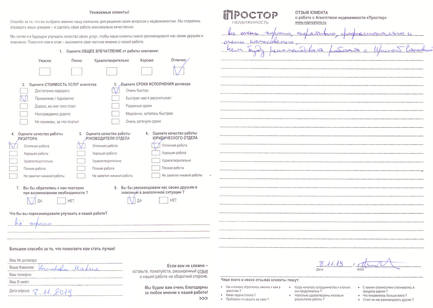 Мой продолжительный опыт общения с вами показывает, что вы меняетесь все время к лучшему! Я довольна буквально всем! Если мне нужна услуга, связанная с недвижимостью, то мой единственный выбор - всегда Простор, конечно, с Евгений Маркопольской