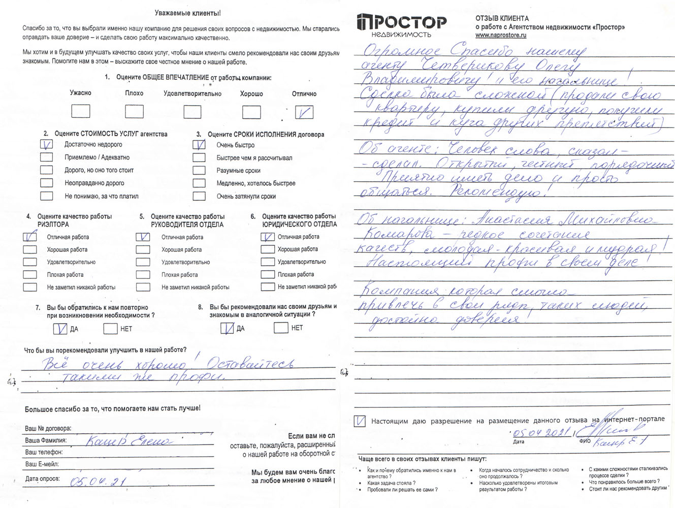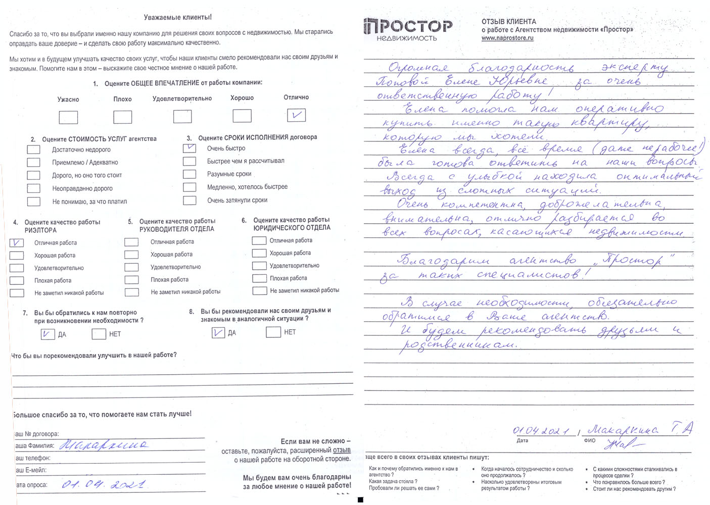 Огромная благодарность эксперту Поповой Елене Юрьевне за очень ответственную работу! Елена помогла нам оперативно купить именно такую квартиру, которую мы хотели. Елена всегда, все время (даже не рабочие) была готовить ответить на наши вопросы. Всегда с улыбкой находила оптимальный выход из сложных ситуаций. Очень компетентна, доброжелательна, внимательна, отлично разбирается во всех вопросах, касающихся недвижимости. Благодарим агентство "Простор" за таких специалистов! В случае необходимости обязательно обратимся в Ваше агентство и будем рекомендовать друзьям и родственникам.