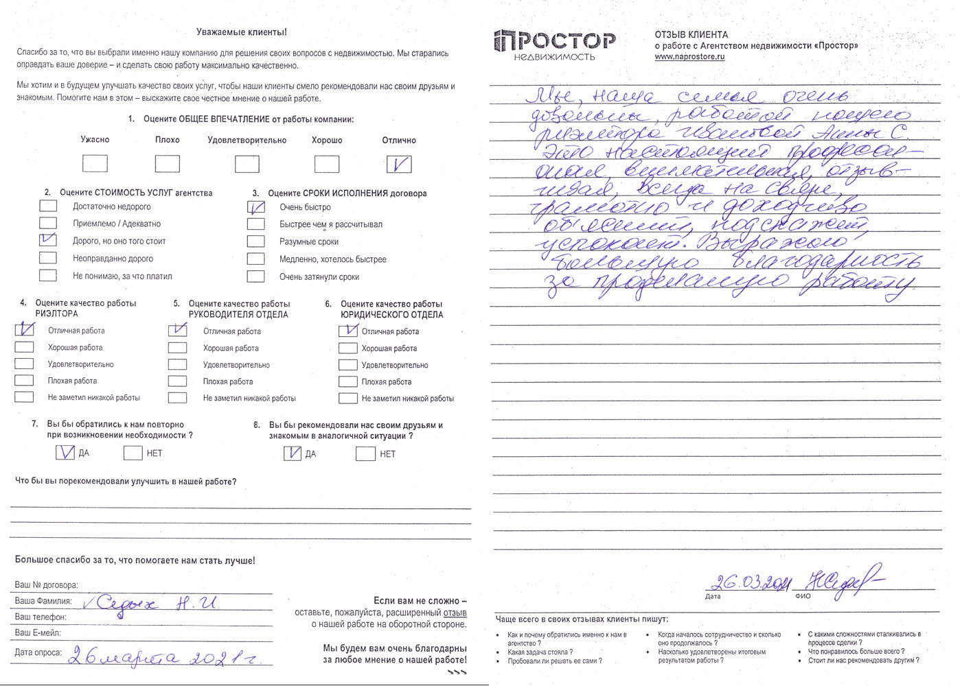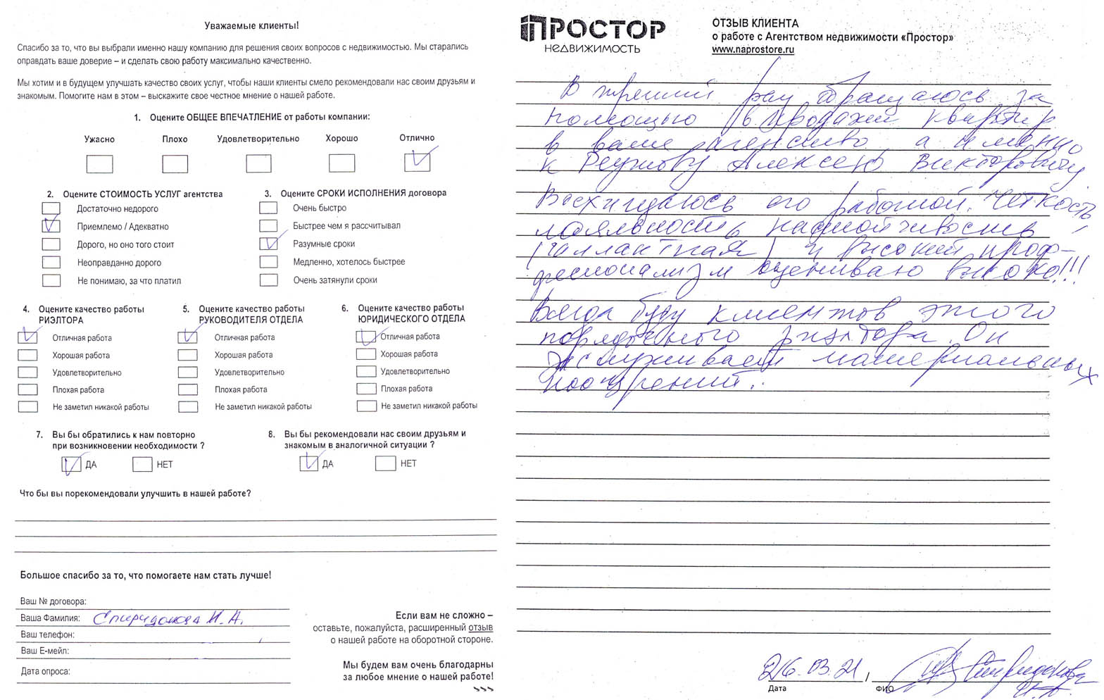 Я, Перов Михаил Германович, и моя дочь, Перова Ксения Михайловна, обращались в фирму "Простор". Продавали и покупали квартиры. И очень рады, что обратились именно в эту фирму. Помогал нам очень профессиональный, внимательный менеджер Игорь Борисович Решетов. Он предлагал нам различные варианты по подбору квартир с учётом наших пожеланий. Аккуратно и чётко оформлялись документы на квартиры, и не было проблем с переводом денег. На всех этапах проведения сделки Игорь Борисович присутствовал лично и контролировал процесс. На все интересующие нас вопросы по сделке мы получали грамотные ответы. Было очень приятно работать с таким интеллигентным, знающим человеком, вызывающим доверие с первого знакомства. Спасибо фирме "Простор", что у Вас работают такие умные и отзывчивые люди, как Игорь Борисович Решетов. У нас был "тяжёлый" случай с продажей и покупкой квартиры, но он помог решить нашу проблему. Даже не ожидали, что всё получится так быстро. Очень ему благодарны. Обязательно будем рекомендовать нашим друзьям и знакомым обращаться в фирму "Простор", особенно к менеджеру Игорю Борисовичу Решетову.