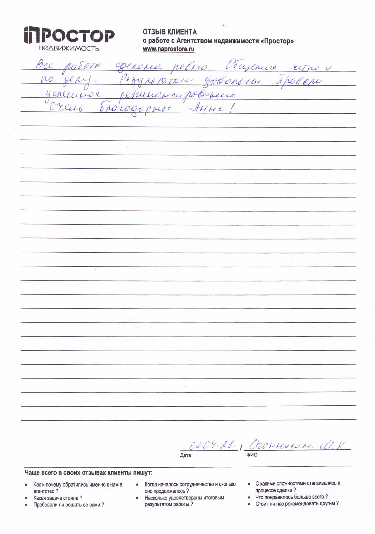 Вся работа сделана ровно. Общение четко и по делу. Результатом довольны. Провели успешное рефинансирование. Очень благодарны Анне!» Оганнисян М.Х.